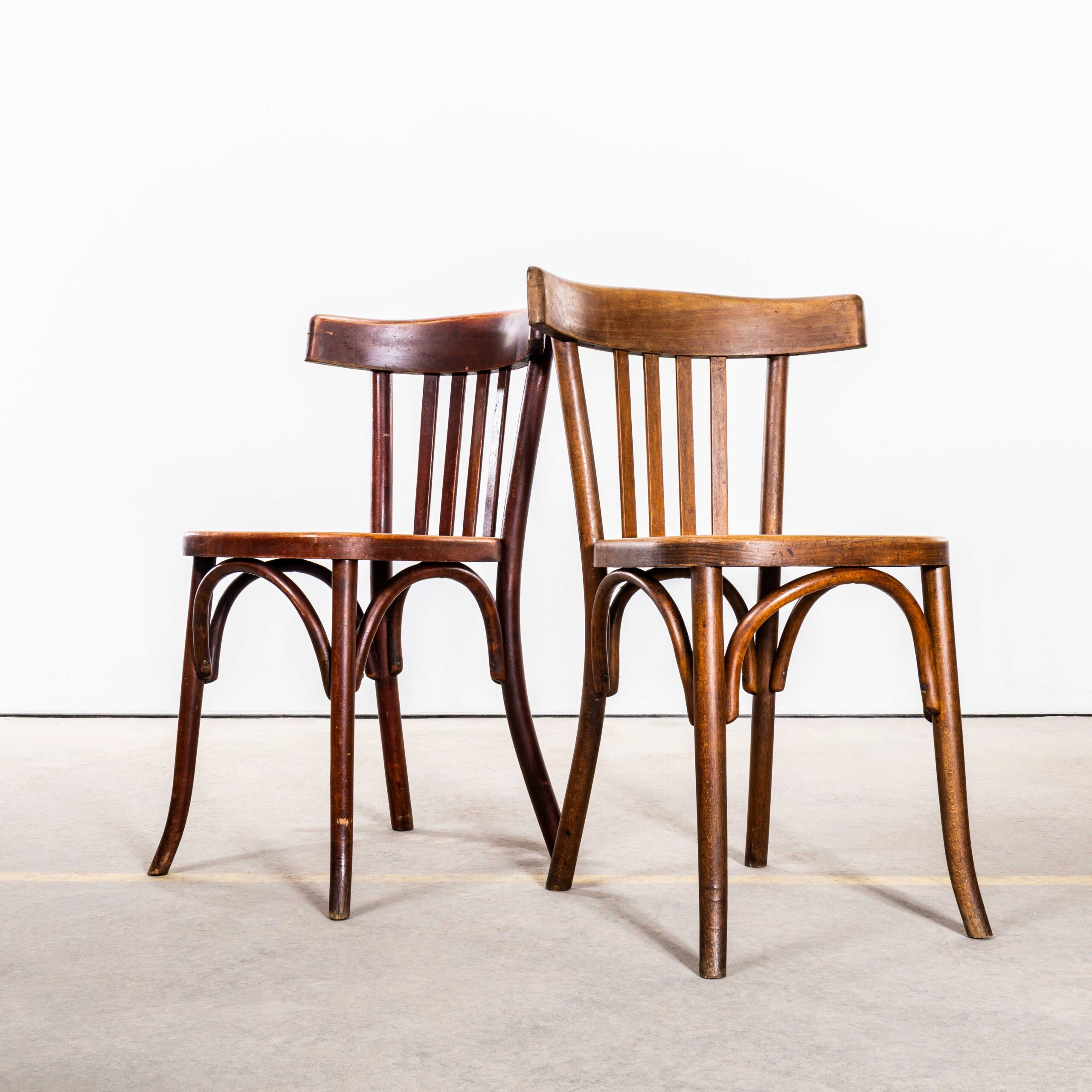1950’s French Dark Oak Bentwood Dining Chairs – Set Of Four. The process of steam bending beech to create elegant chairs was discovered and developed by Thonet, but when its patents expired in 1869 many companies including Fischel launched production. Fischel was founded in 1871 by Czech born David Gabriel Fischel, a successful vegetable oil merchant, using the first hand knowledge of his eldest son who had worked in one of Thonets Czech factories. First production was made in Germany in Niemes near the Danube. Later production moved to France in Alsace and sales offices were opened in most major French cities as Fischel became a major chair producer. The chairs do not have a makers mark but we believe them to be Fischel. These chairs date from the 1950’s, a classic shape with a rich colour and character and all in good condition. We service and wax each chair before it leaves our workshop and we deliver chairs of excellent quality.