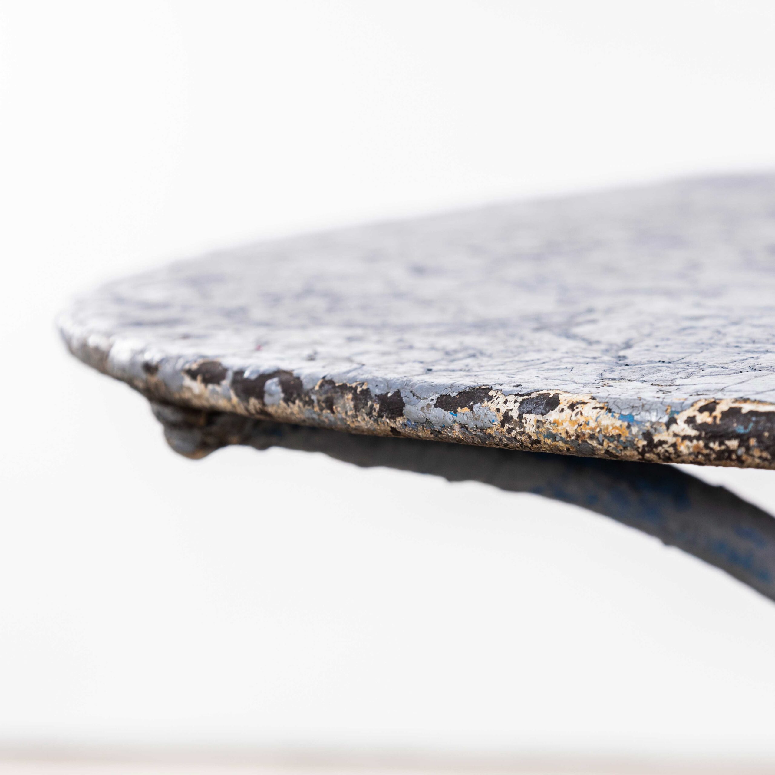 1950’s French Grey Metal Round Outdoor Small Gueridon Table. Classic French gueridon table with three solid bar hand shaped legs with a central riveted support ring and delicate curved feet on a tripod base. Original paint.