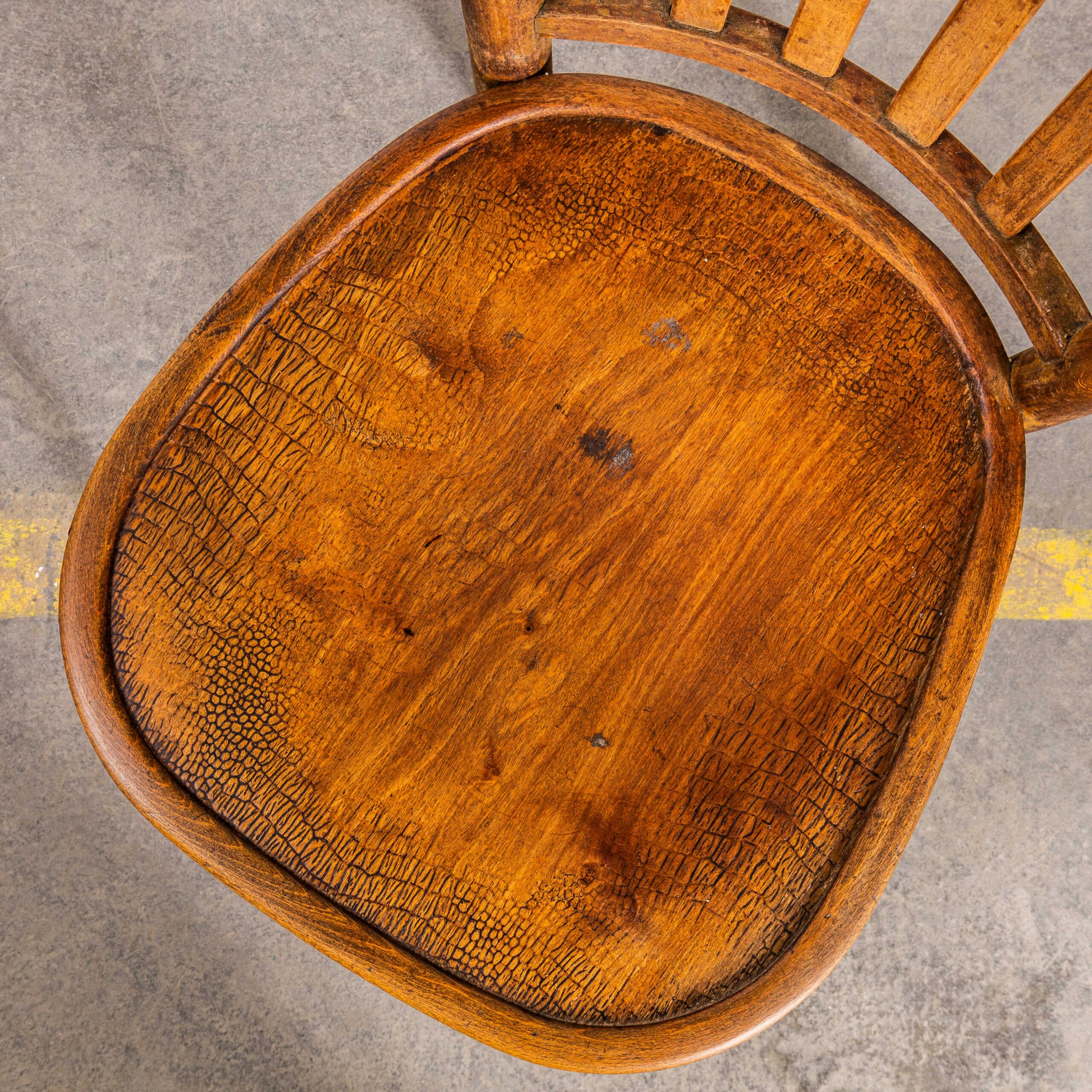 1950’s French Ox Back Slatted Bentwood Dining Chairs – Set Of Eight. The process of steam bending beech to create elegant chairs was discovered and developed by Thonet, but when its patents expired in 1869 many companies including Fischel launched production. Fischel was founded in 1871 by Czech born David Gabriel Fischel, a successful vegetable oil merchant, using the first hand knowledge of his eldest son who had worked in one of Thonets Czech factories. First production was made in Germany in Niemes near the Danube. Later production moved to France in Alsace and sales offices were opened in most major French cities as Fischel became a major chair producer. The chairs do not have a makers mark but we believe them to be Fischel. These chairs date from the 1950’s, a classic shape with a rich colour and character and all in good condition. We service and wax each chair before it leaves our workshop and we deliver chairs of excellent quality.