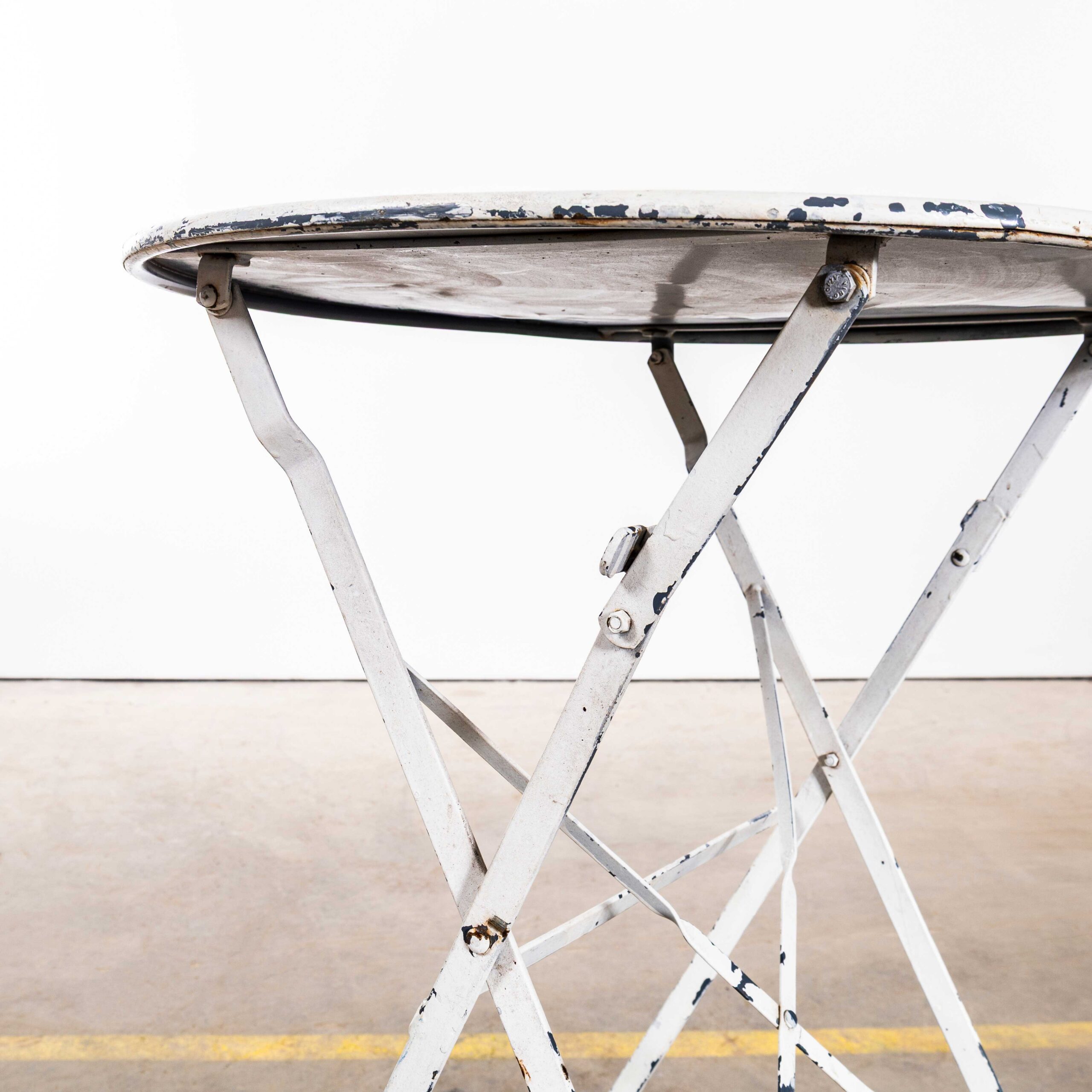 1950’s French Small Round White Metal Folding Dining Table. Good honest French metal dining table with a hand forged classic folding base and the original sheet metal top. The base has a graceful cross stretcher and cross frame. We love the worn white colour and the character of the original blue paint poking through. The table is solid and in excellent condition, our workshop has gently serviced and restored the table.