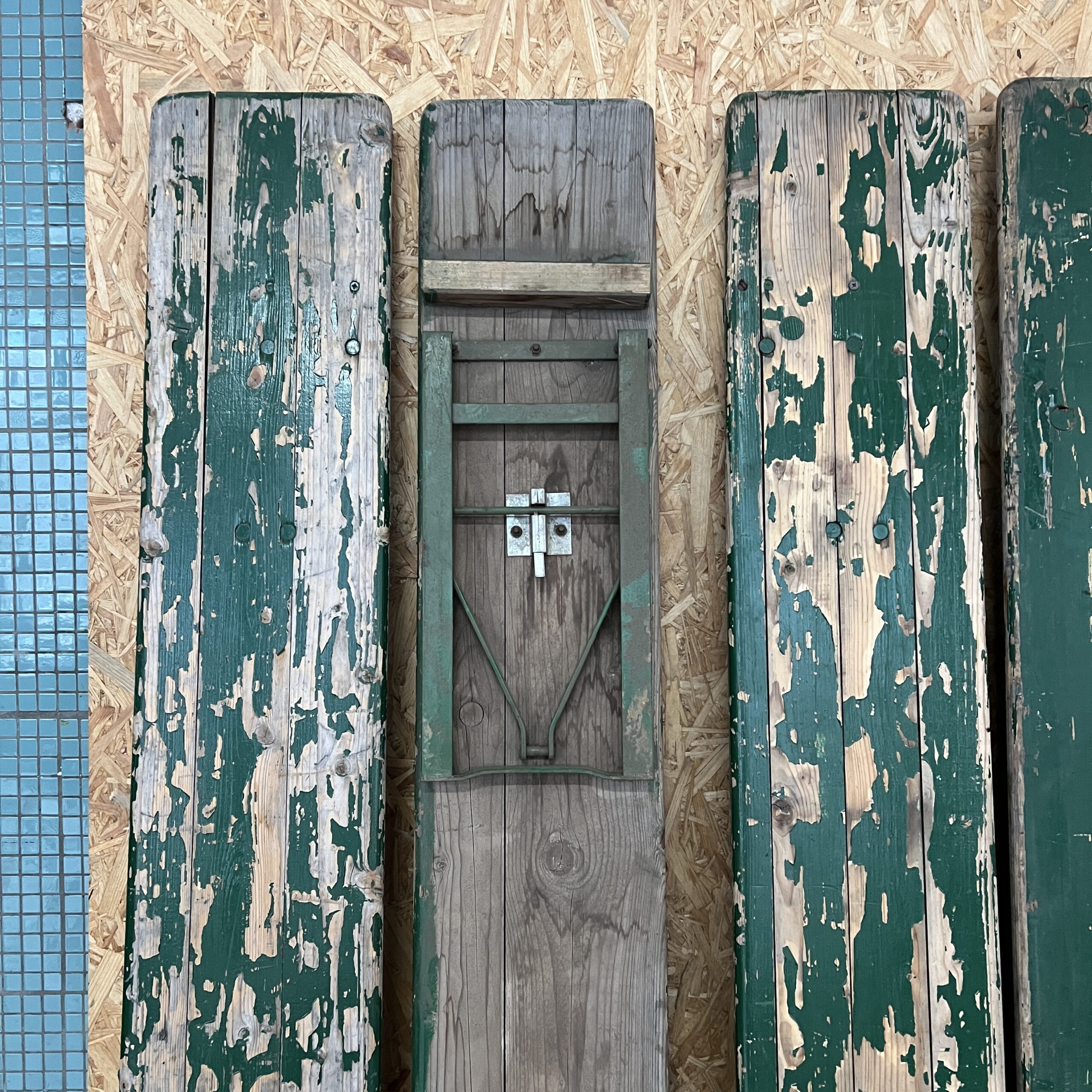 1950’s Green Ex Army Large French Folding Bench & Table Set. These unique sets are made from solid pitch pine, they have folding legs which fold flat for easy storage. Each set varies, some have painted tops, some have coloured bases. Listing is for two benches and one table.