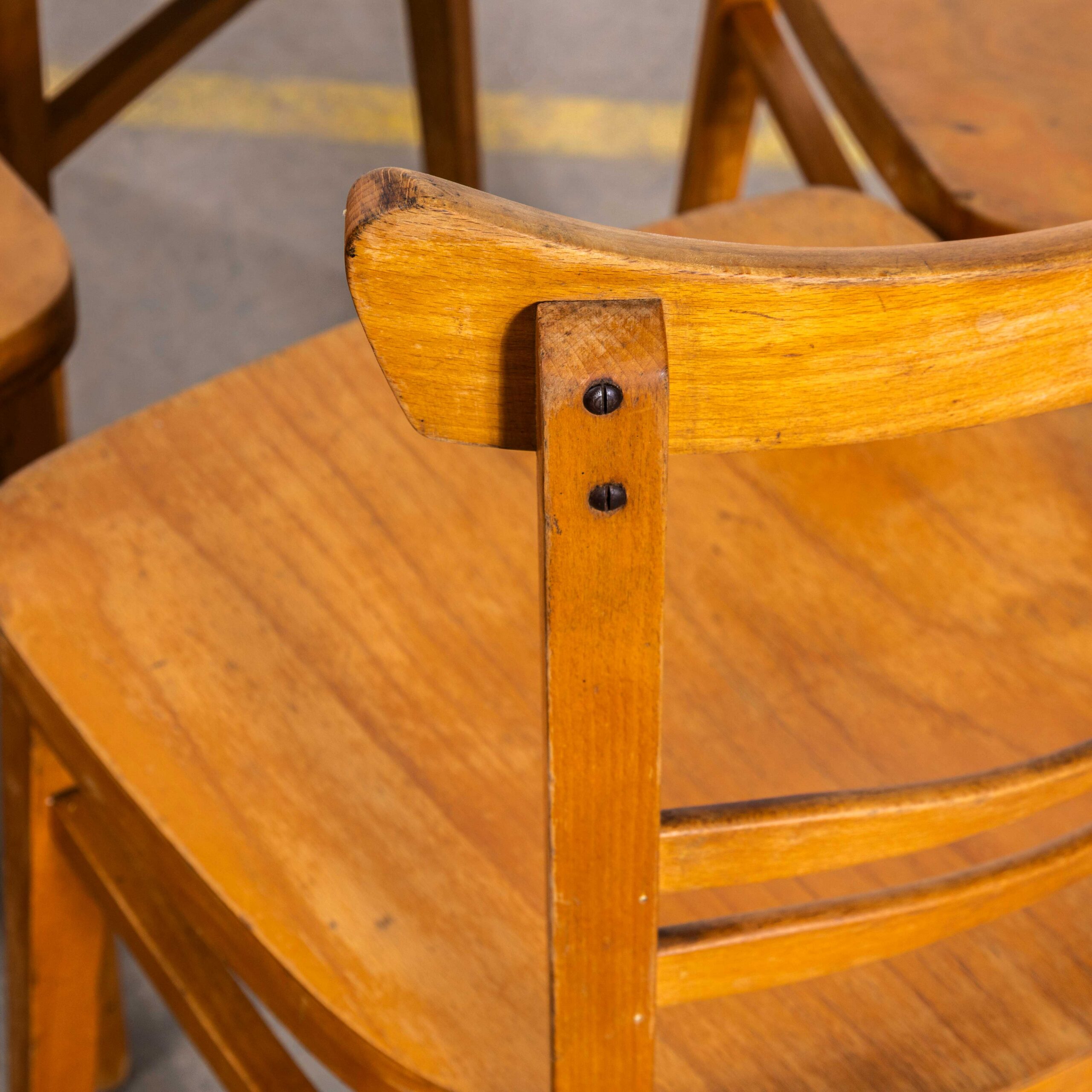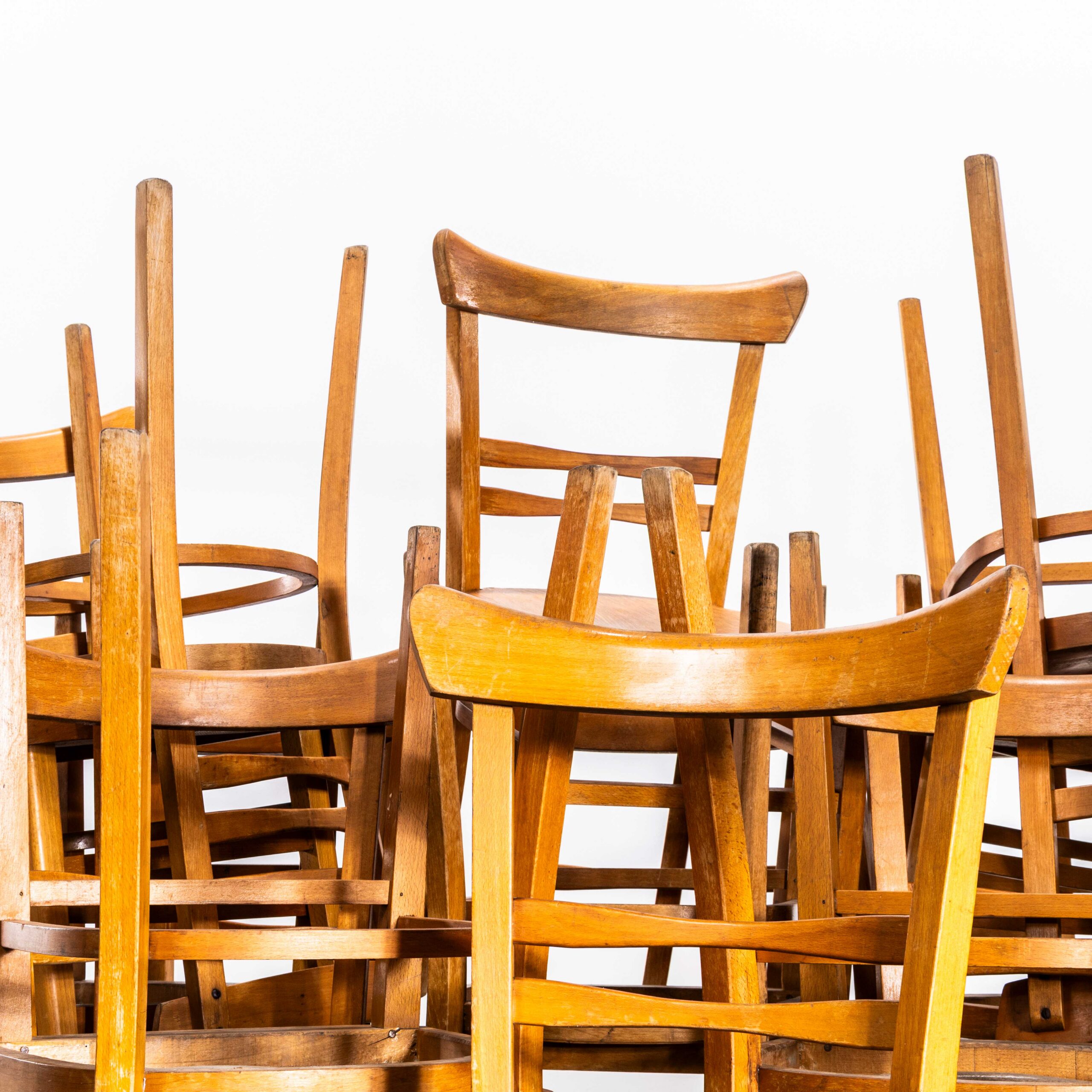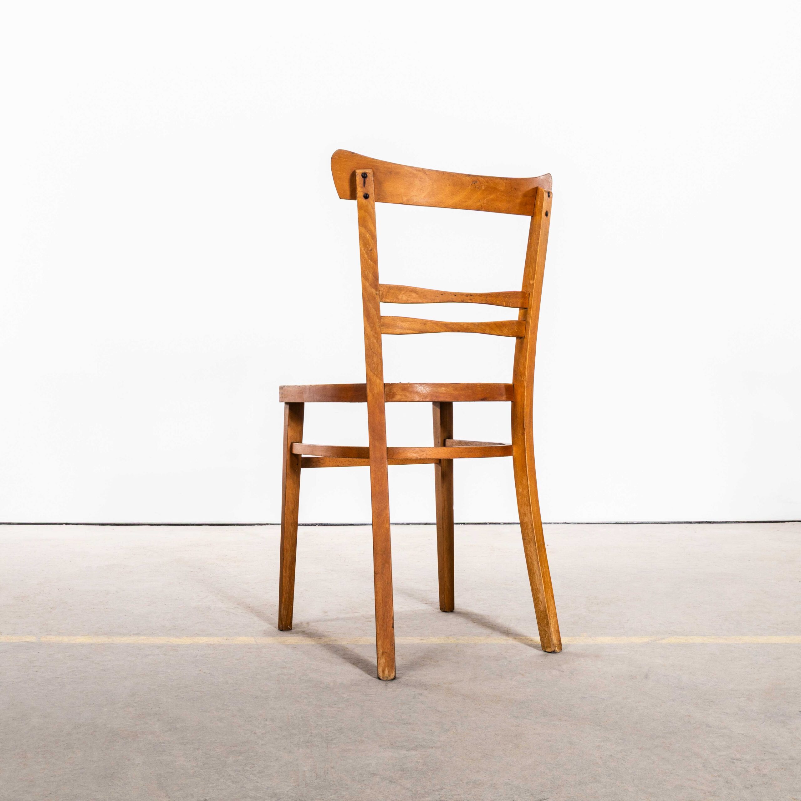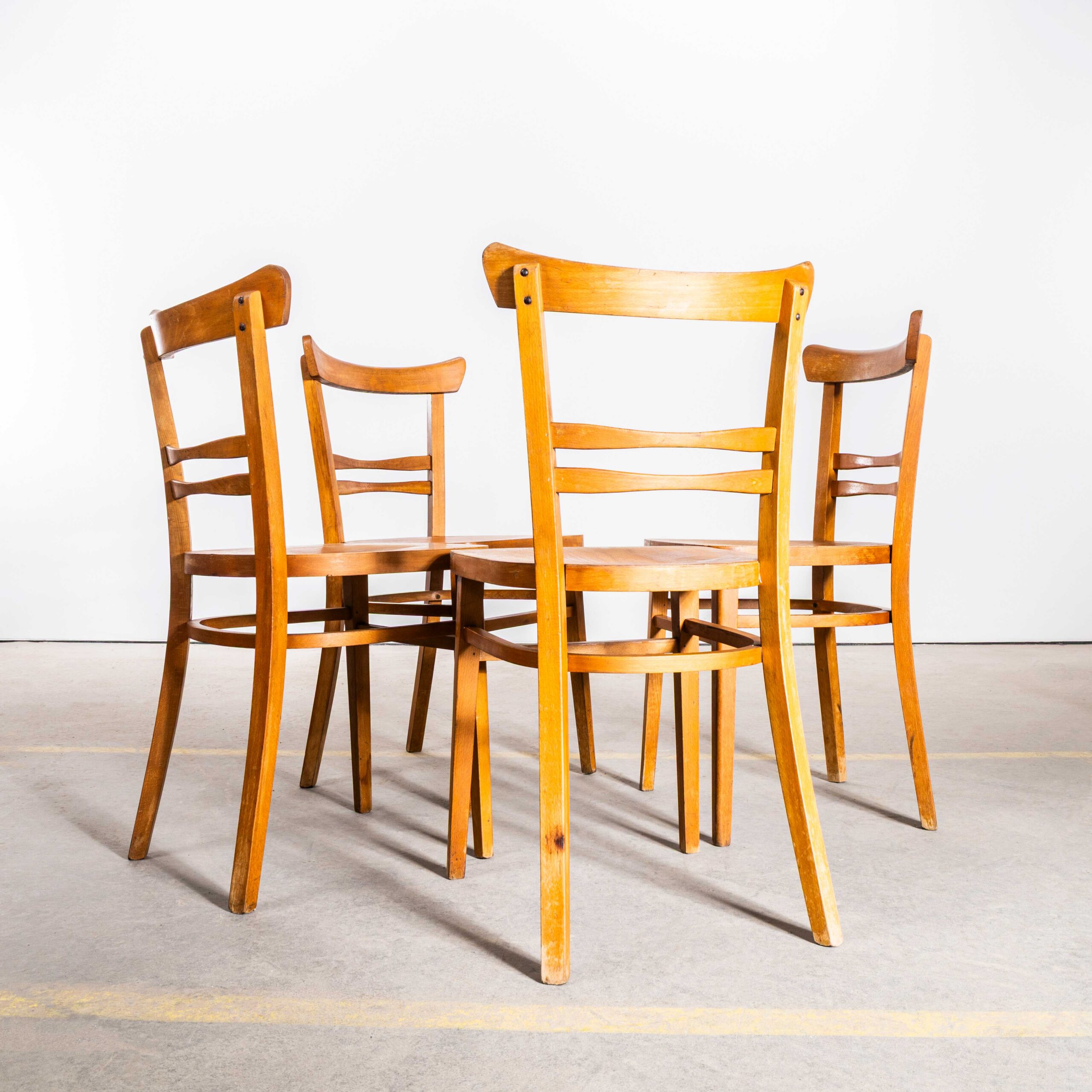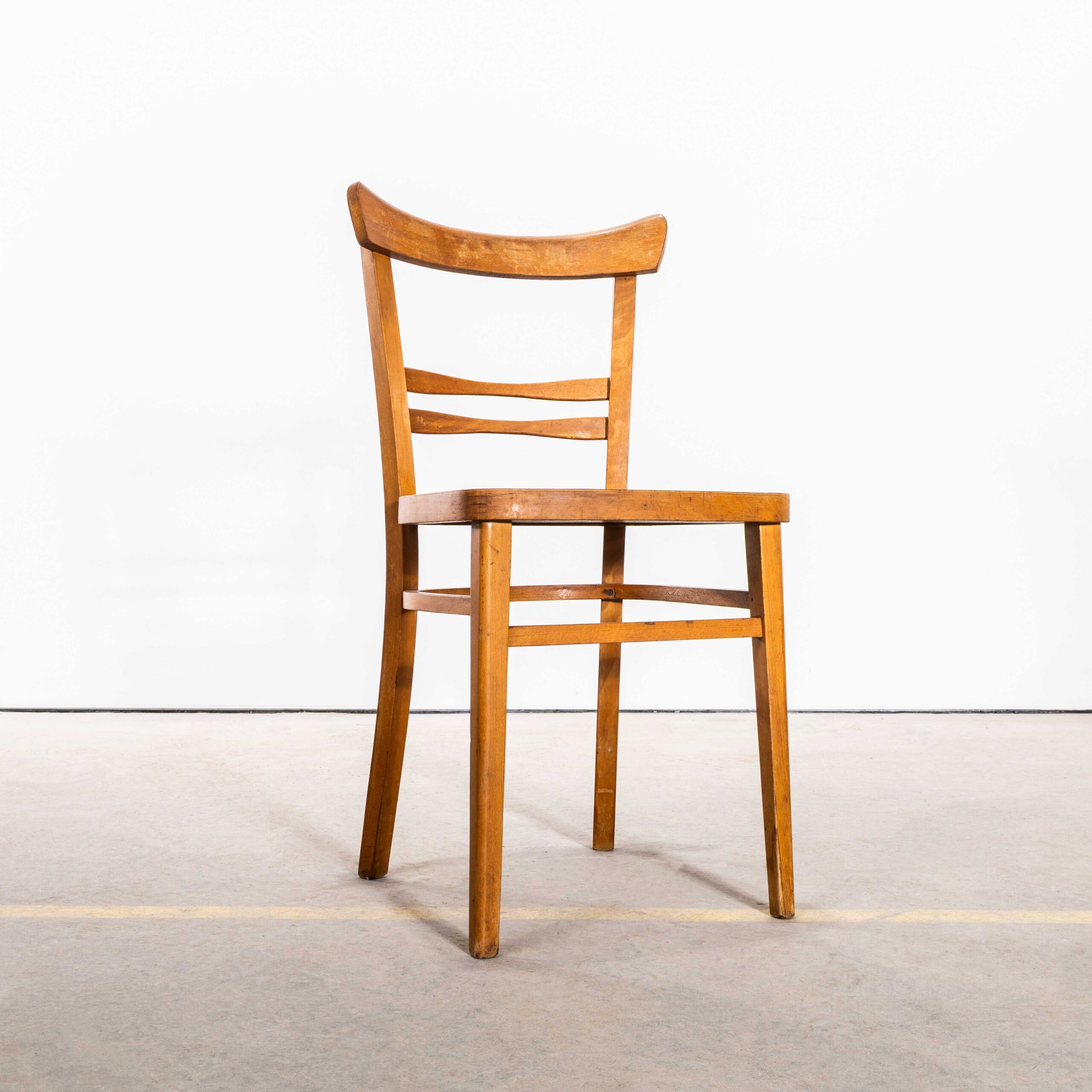 1950’s Honey Café Ton Bentwood Dining Chairs. High quality good scale dining chairs produced by the famous Czech firm Ton, still trading today and producing beautiful chairs. After World War II, the Thonet factory in Bystřice pod Hostýnem (Czech Republic) was nationalized by the state in the era of communism in Czechoslovakia. In 1953, the company was officially renamed TON, which is an acronym for Továrny na Ohýbaný Nábytek, meaning “Bentwood Furniture Factory” in Czech. We have gently restored the chairs but kept the original character and patina which is what this chair is all about. A strong sturdy chair of good scale and unusually detailed design. We service each chair individually before it leaves our workshop and we deliver chairs of excellent quality.