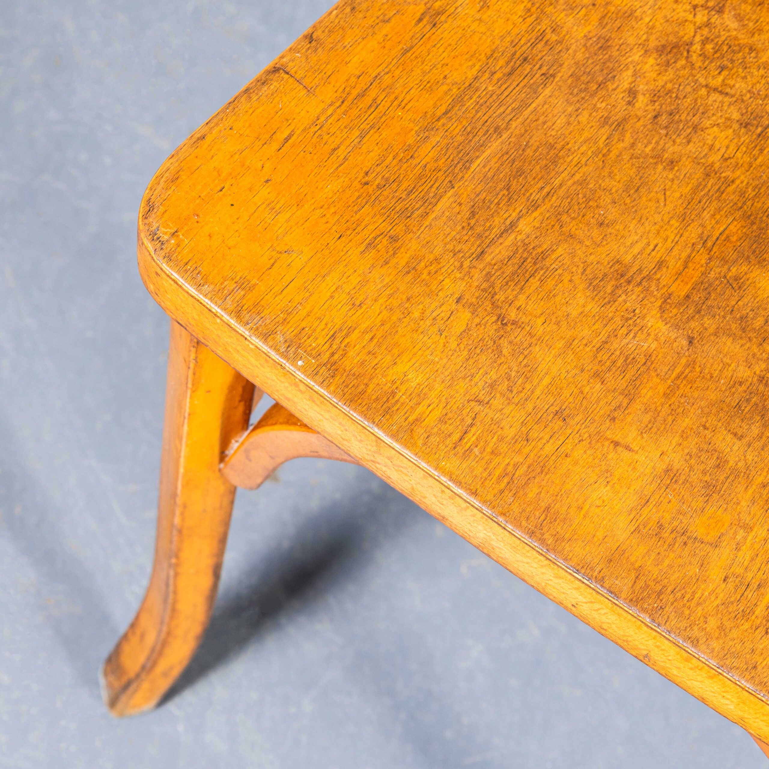 1950’s Honey Thin Slim Back Baumann Dining Chairs – Set Of Six. Classic beech bistro chair made in France by the maker Baumann. Baumann is a slightly off the radar French producer just starting to gain traction in the market. Baumann was founded in 1901, by Swiss man Emile Baumann, in Colombier Fontaine, France. Baumann started producing a simple child’s chair but grew rapidly to be a large bentwood producer with showrooms all over France. In our view the chairs of the 50’s and 60′ are their best, beautifully made and designed. Stunning original faded colour and character. We service and wax each chair before they leave our workshop and we deliver chairs of excellent quality.