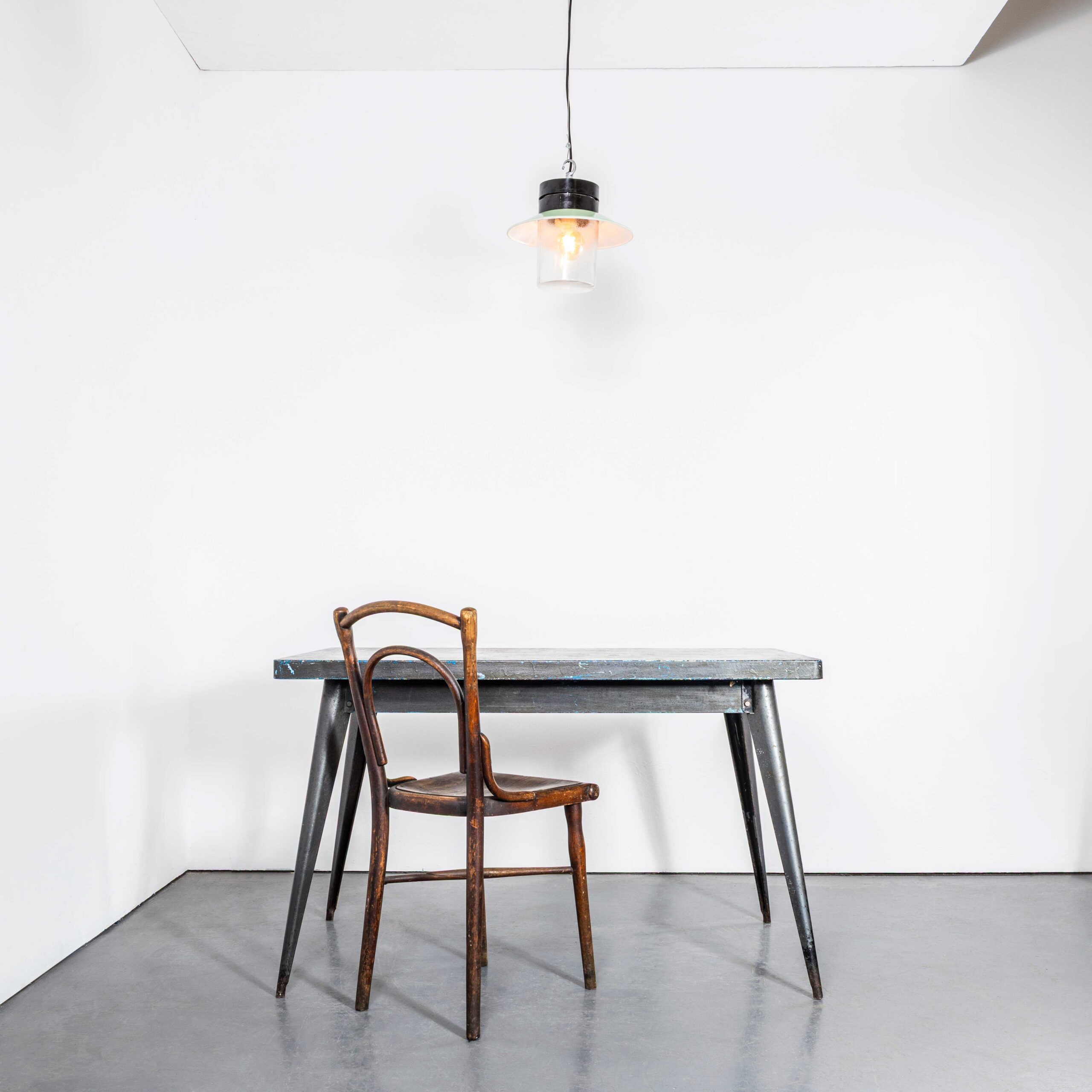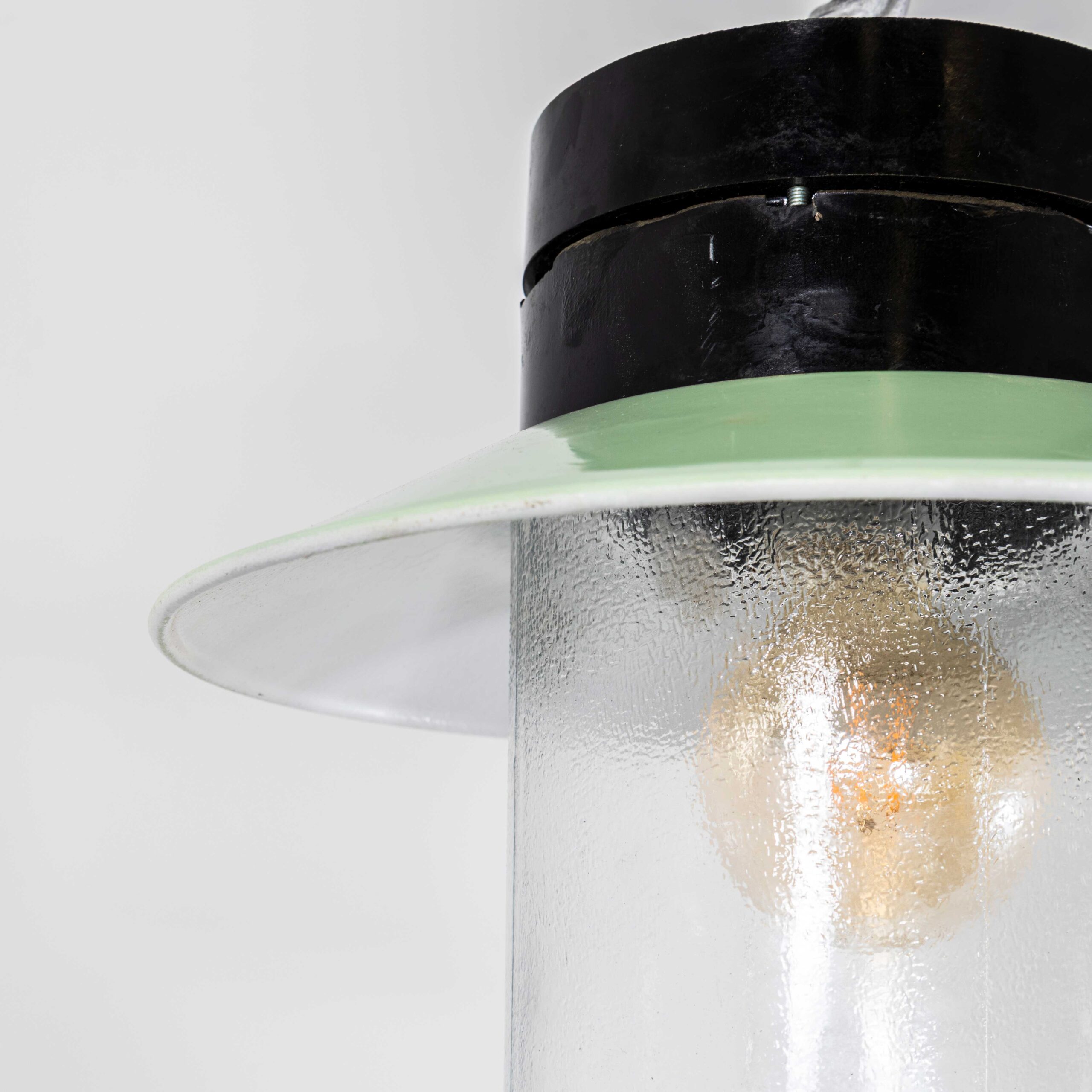 1950’s Industrial Bakelite Top Pendant Lamps. Please note in this design there are a number of slightly different glass domes, each design is listed separately. Sourced in Eastern Europe the lamps are completely original with bold Bakelite tops, an enamelled mint green shade and cast glass domes. Each lamp has been cleaned and restored and all electrical components have been removed and replaced with modern European CE standard components to BS EN 60598. Each lamp is individually tested and labelled to BS EN 60598. INCLUDED: Each lamp comes completely wired and ready to install including; 2 metres of wire for hanging the lamps, 2 metres of black silk covered electrical cable and a ceiling hook as shown. We can also supply more than 2 metres of hanging cable/wire/chain etc. as required, please contact us separately to discuss. The lamp is fitted with a standard E27 threaded lamp holder for which a wide range of modern and vintage style filament bulbs are widely available. We do not currently sell bulbs and recommend LED bulbs 6W maximum. We are specialists in refurbishment of vintage lighting, please contact us with any questions regarding purchase or installation. The lamp is currently wired and fitted for UK and EU compliance. The lamp can be wired for compliance in the US or any global market. Listing is for one lamp.