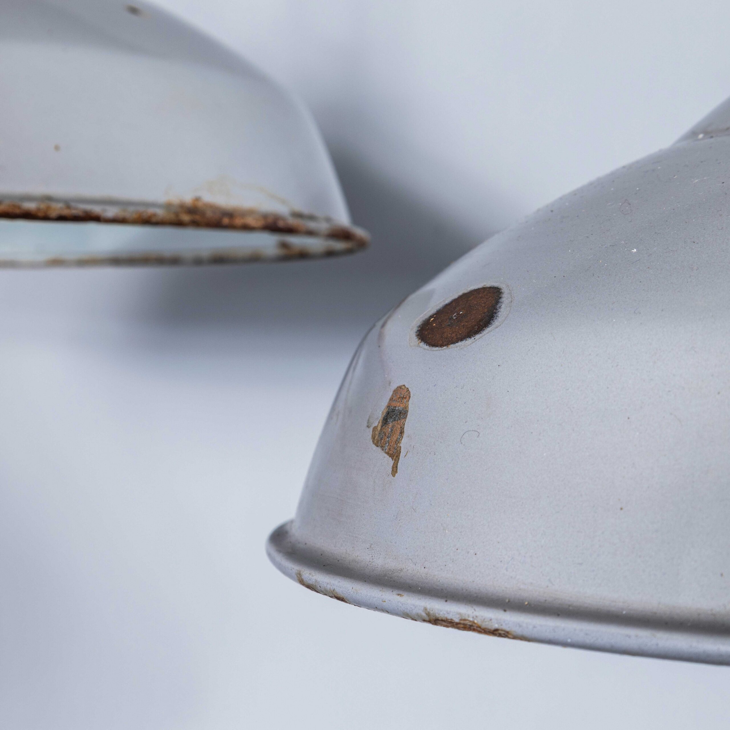 1950’s Industrial Benjamin Enamelled Grey Pendant Lamps (Model 5) – 14 Inch. Benjamin was arguably the market leader in industrial lighting in the 1930’s through to 1960’s. Their main market was providing tough enamelled lamps to large factories. These lamps came from a warehouse in Doncaster. The lamps were covered in paint, grease and dirt which was removed to reveal lamps in exceptional original condition. Each lamp has been cleaned and restored and all electrical components have been removed and replaced with modern European CE standard components to BS EN 60598. Each lamp is individually tested and labelled to BS EN 60598. INCLUDED: Each lamp comes completely wired and ready to install with integrated cable clamps allowing the lamps to self hang on the electrical flex. The lamp comes with 2 metres of black silk covered electrical cable and integrated clamp ceiling hook as shown. The lamp is fitted with a standard E27 threaded lamp holder for which a wide range of modern and vintage style filament bulbs are widely available. We do not currently sell bulbs and recommend LED bulbs 6W maximum. We can also supply more than 2 metres of wire as required, please contact us separately to discuss. We are specialists in refurbishment of vintage lighting, please contact us with any questions regarding purchase or installation. The lamp is currently wired and fitted for UK and EU compliance. The lamp can be wired for compliance in the US or any global market.