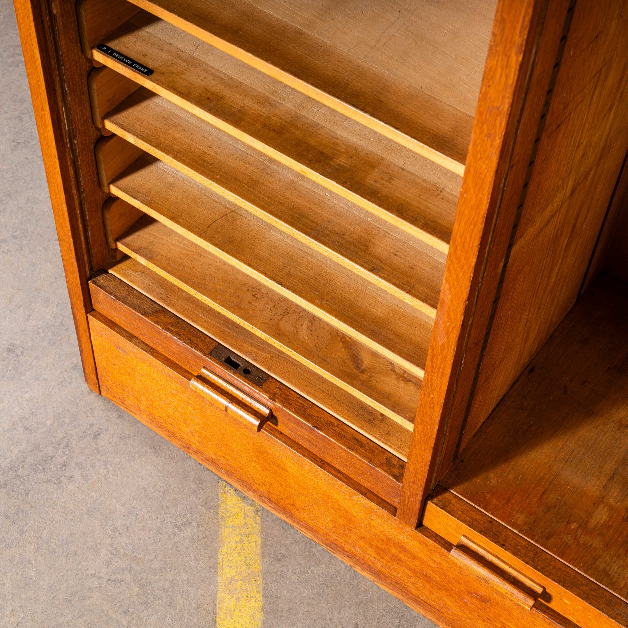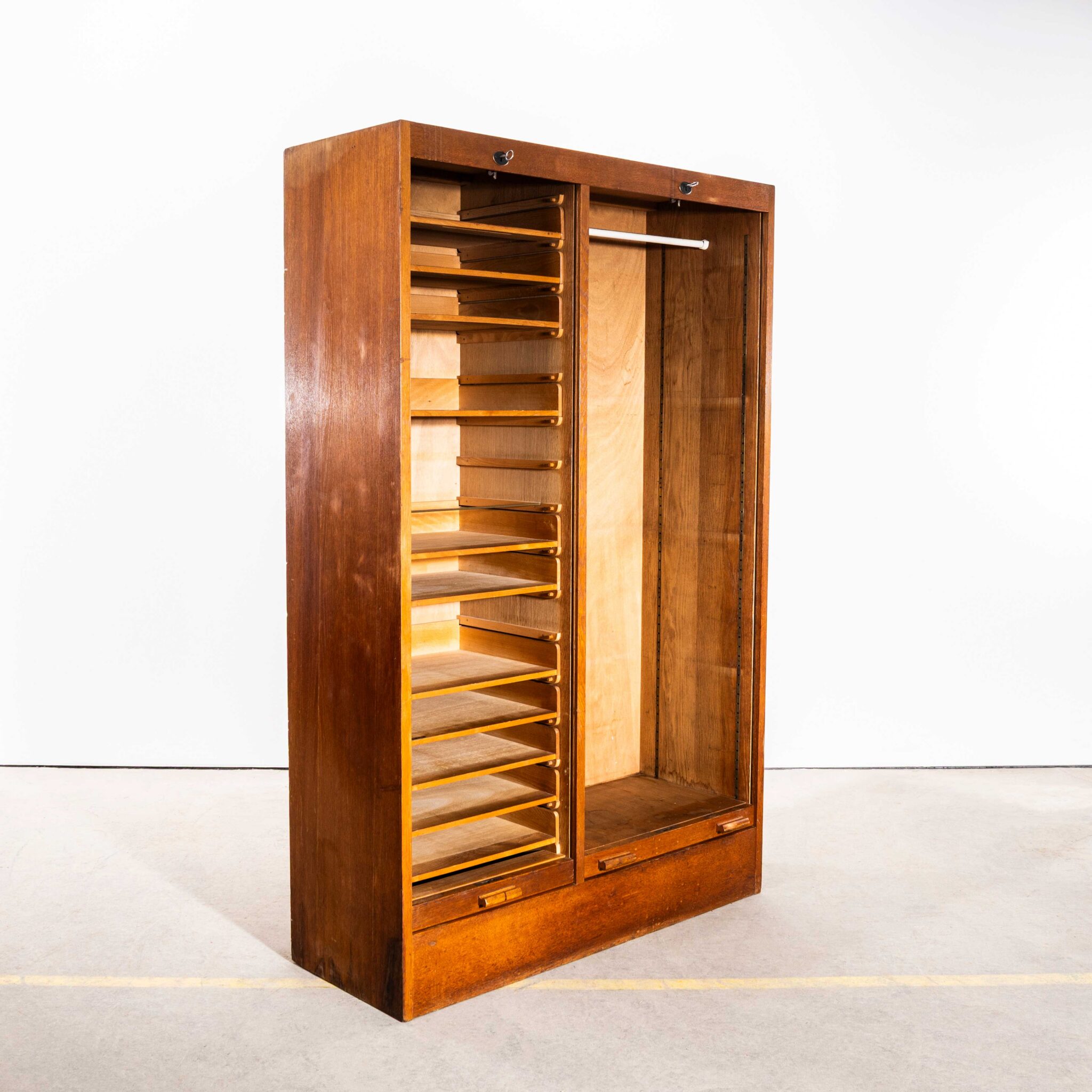1950’s Large French Double Tambour Atelier Cabinet. Classic tambour cabinet made mainly in oak with adjustable birch shelves. The cabinet features two lockable tambour doors which scroll down smoothly and retain the original keys. Our workshop has cleaned, serviced and waxed the cabinet, it is good to go.