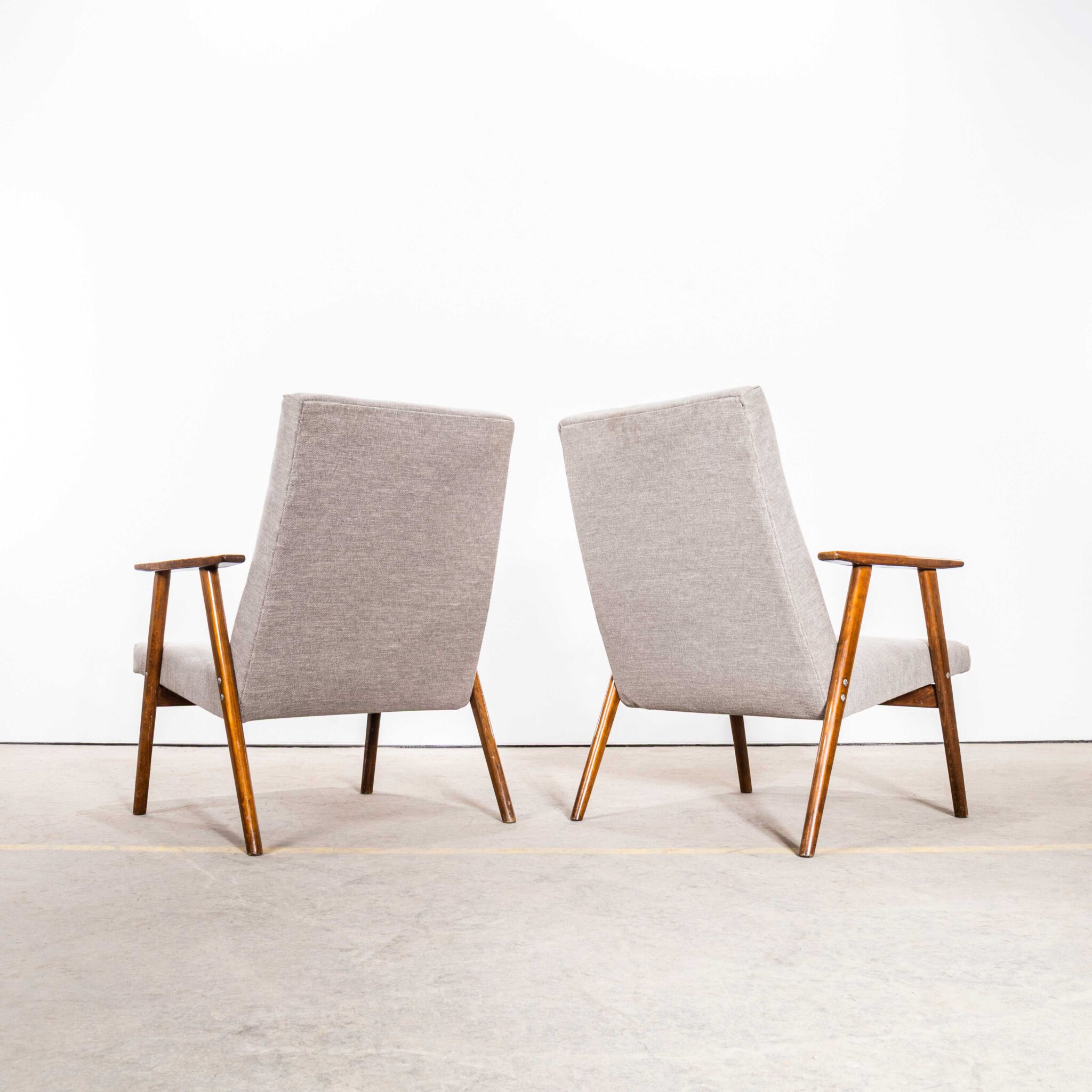 1950’s Mid Century Upholstered Armchairs With Straight Arms and Top Caps In Grey Brushed Cotton. Sourced in Scandinavia this is a fully restored pair of mid century armchairs. The frame is beech throughout and the arms have been cleaned and waxed but retain their original character. The internal beech frame has been carefully restored, the internal foam and components have been checked and replaced as required by our workshop team. To comply with UK fire regulations the internal components are covered in a flame retardant barrier cloth. We have selected this brand new grey brushed cotton fabric and reupholstered the chairs throughout.