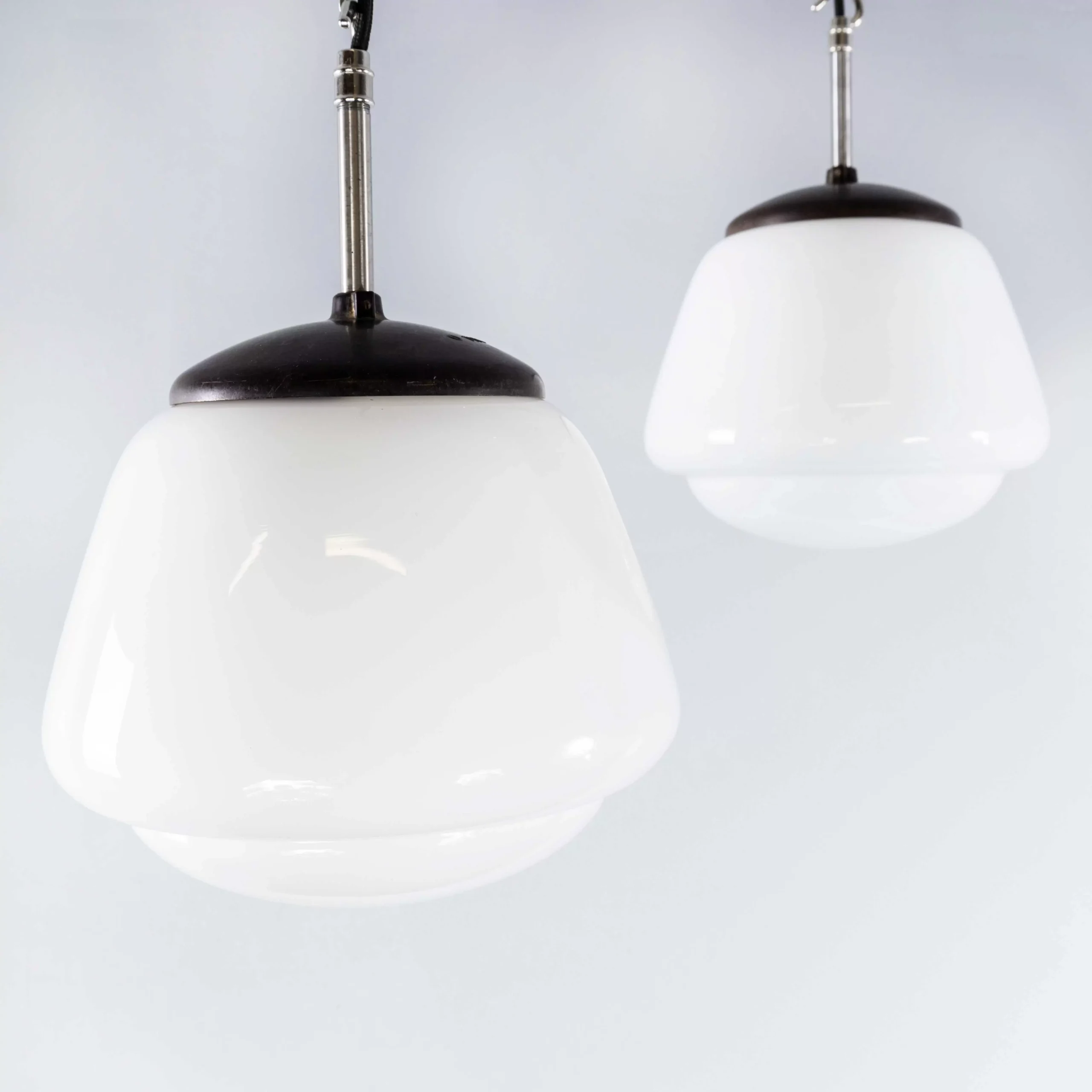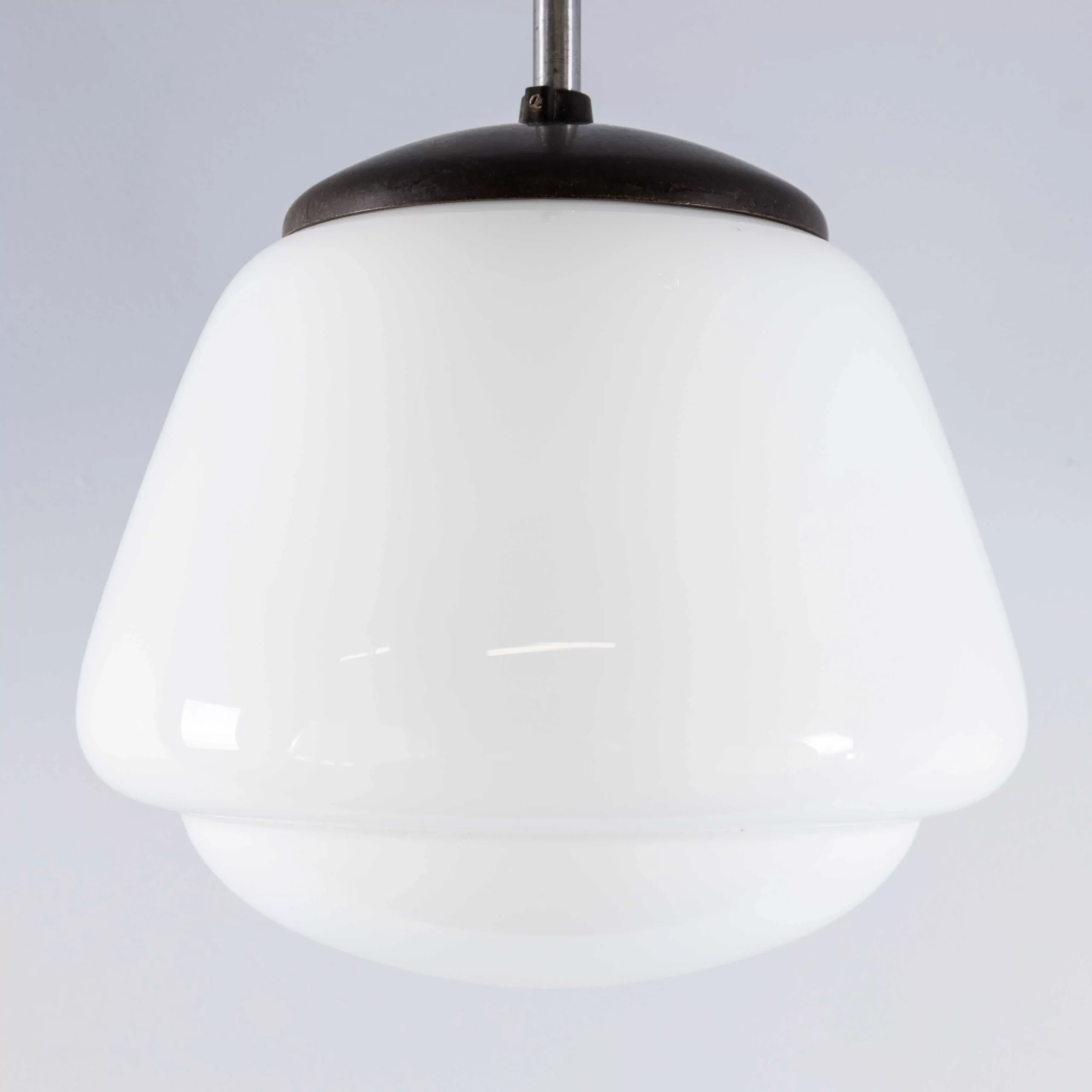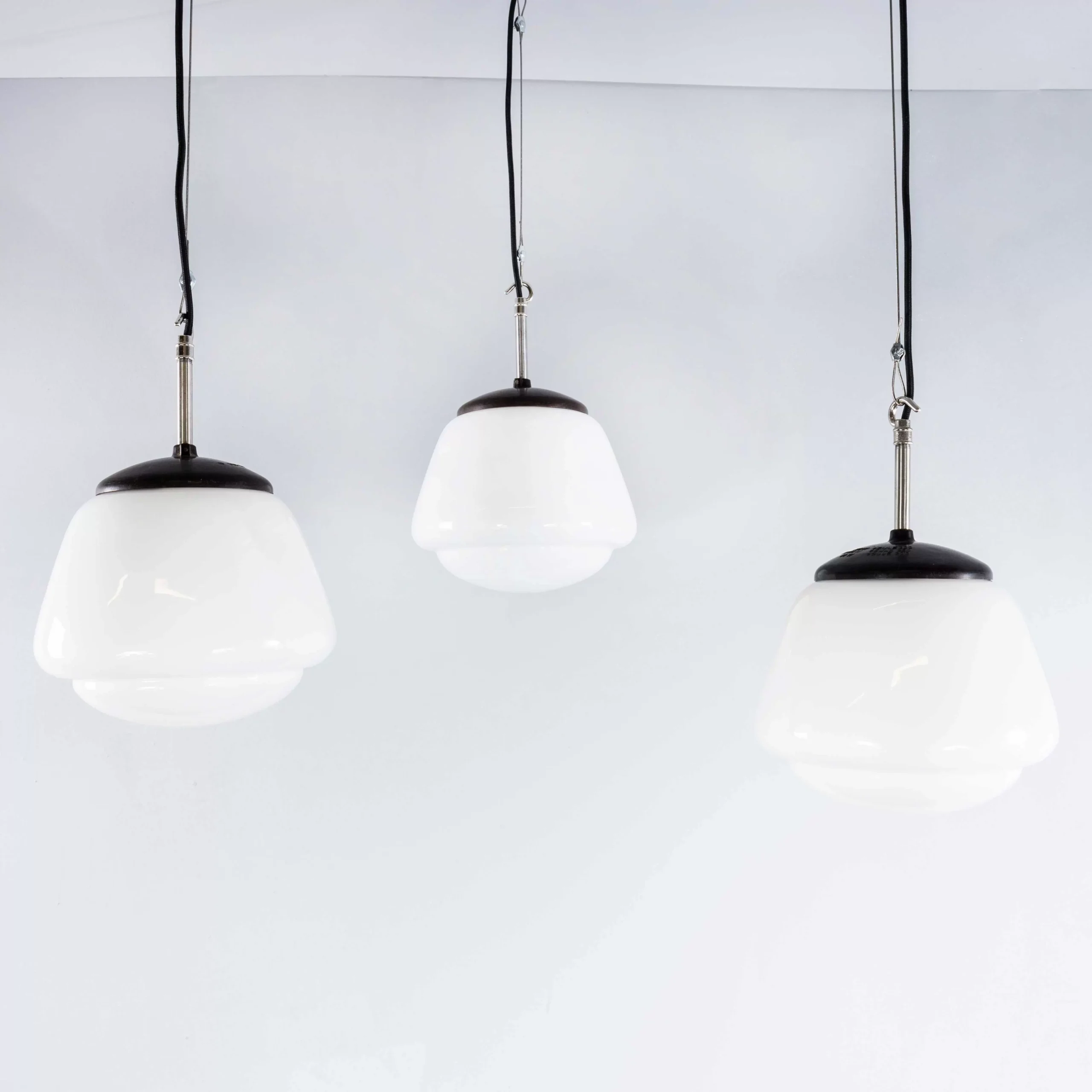 1950’s Original Mouth Blown Splayed Button Opaline Pendant Lamp. Beautiful original ribbed opaline pendant lamps featuring mouth blown glass in a splayed shape with a button bottom. We have a number of these stunning original lamps available, salvaged from a hotel in the Czech republic. The gallery tops and ceiling cup are the original Bakelite. Each lamp has been cleaned and restored and all electrical components have been removed and replaced with modern European CE standard components to BS EN 60598. Each lamp is individually tested and labelled to BS EN 60598. INCLUDED: Each lamp comes completely wired and ready to install including; 2 metres of stainless steel 2mm diameter wire rope for hanging the lamp (with 2 easy to use simplex grips), 2 metres of black fabric covered electrical cable and a ceiling hook as shown. The lamp is fitted with a standard E27 threaded lamp holder for which a wide range of modern and vintage style filament bulbs are widely available. We do not currently sell bulbs and recommend LED bulbs 6W maximum. We can also supply more than 2 metres of hanging cable/wire/chain etc. as required, please contact us separately to discuss. We are specialists in refurbishment of vintage lighting, please contact us with any questions regarding purchase or installation. The listing is for one lamp.