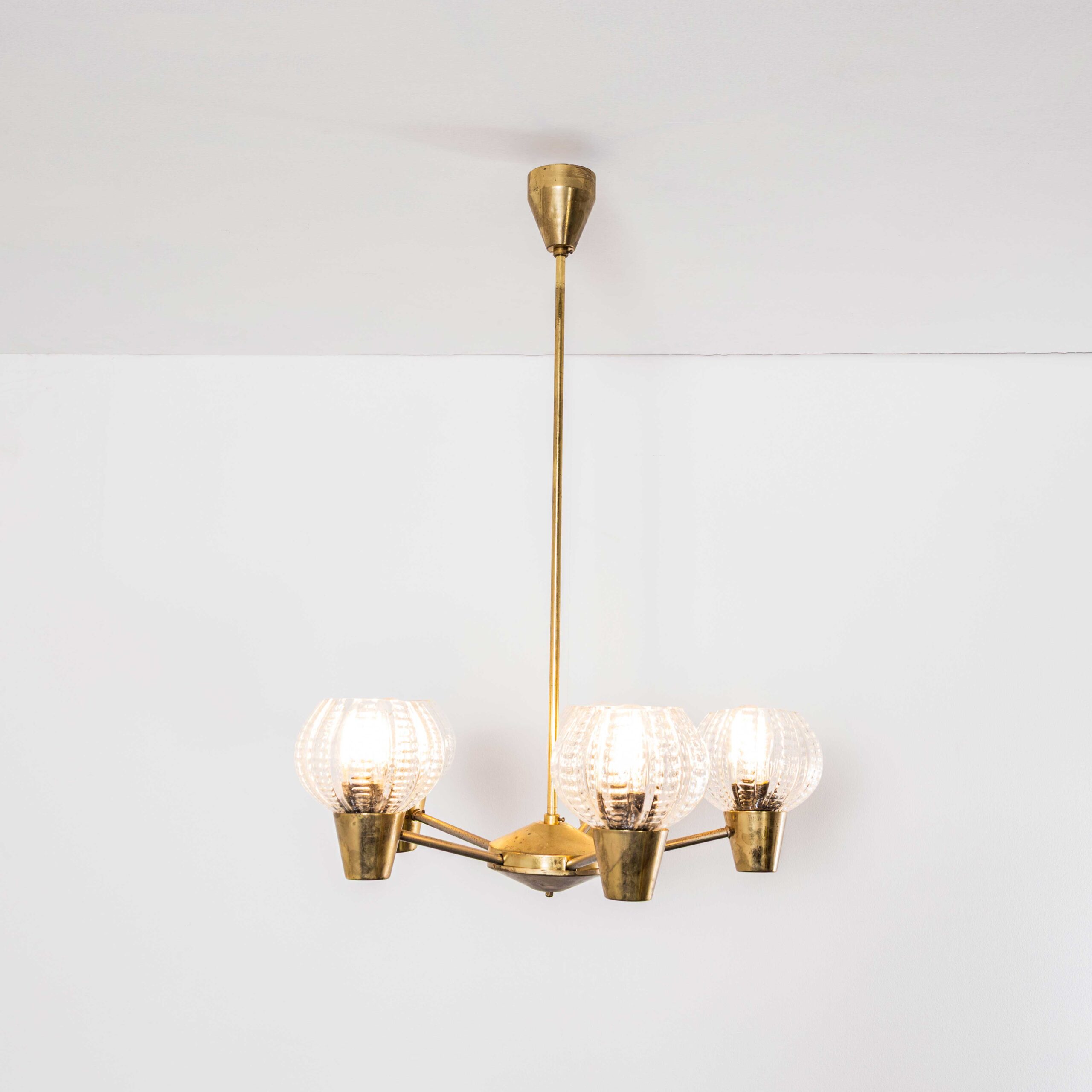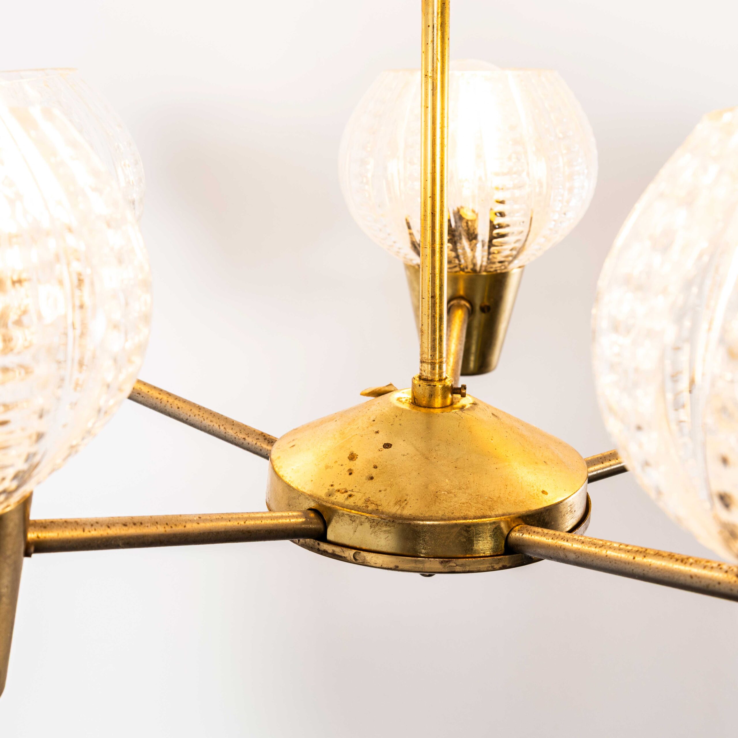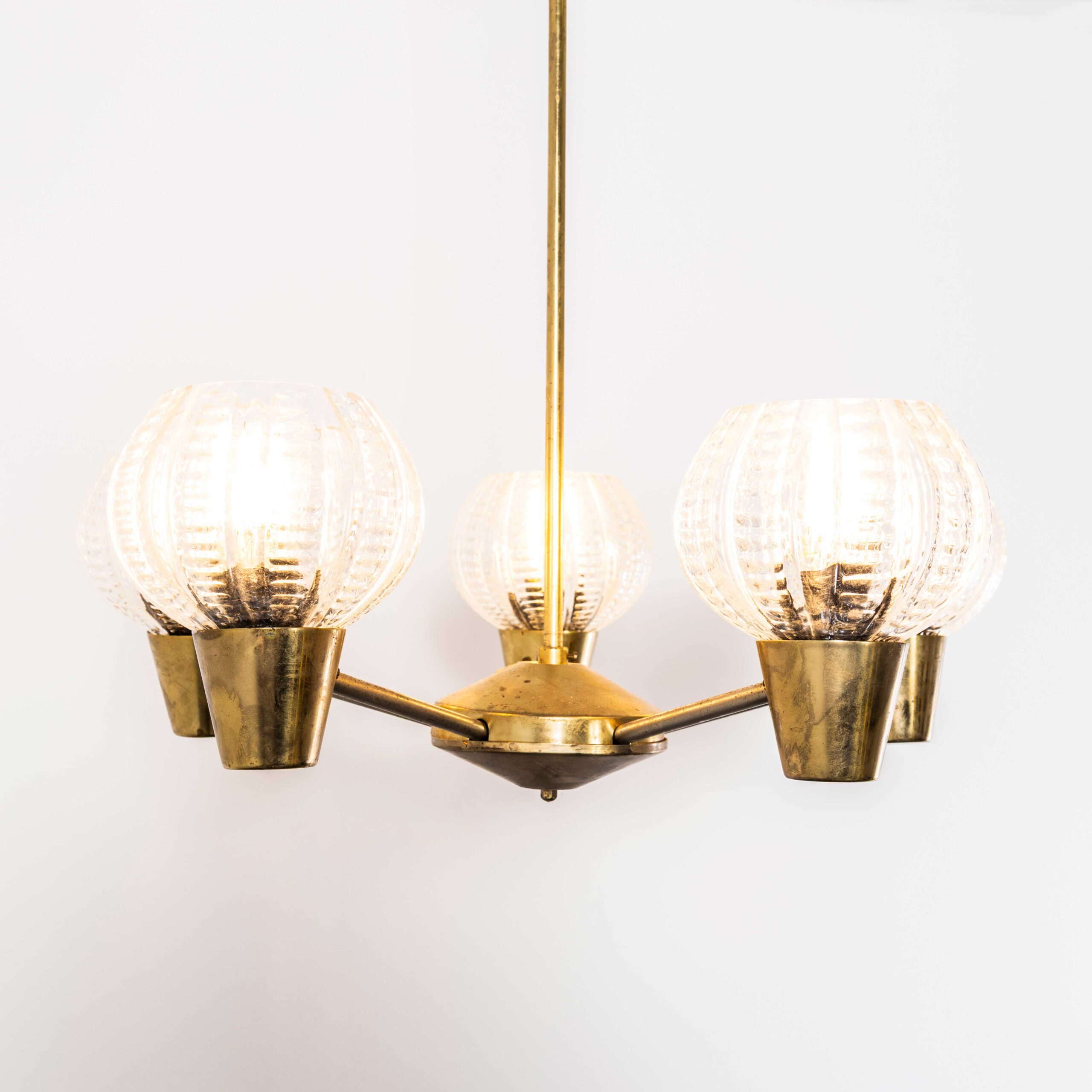 1950’s Prismatic Five Pod Crystal Pendant Chandelier. Extraordinary prismatic glass lamp mouth blown in crystal by the iconic Lustry Kamenicky Senon glassworks. The Czech republic has a rich international history of glass production championed by the iconic Lustry Kamenicky Senon glassworks who were the masters of mouth blown crystal. In exceptional original condition, the glass is suspended on the original brass fittings and comes complete and ready to hang on the original rod. All our lamps have been carefully restored and all electrical components have been removed and replaced with modern European CE standard components to BS EN 60598. In this case due to the nature of the design we have left the original Bakleite fittings. The lamp is tested and labelled to BS EN 60598. The lamp comes completely wired and ready to install. The lamp is fitted with standard E27 threaded lamp holders for which a wide range of modern and vintage style filament bulbs are widely available. The lamp is currently wired and fitted for UK and EU compliance. The lamp can be wired for compliance in the US or any global market. We do not currently sell bulbs and recommend LED bulbs 6W maximum. The lamp hangs 70cm from the ceiling to the bottom of the lamp. It is possible for a small charge to shorten or extend the hanging length.
