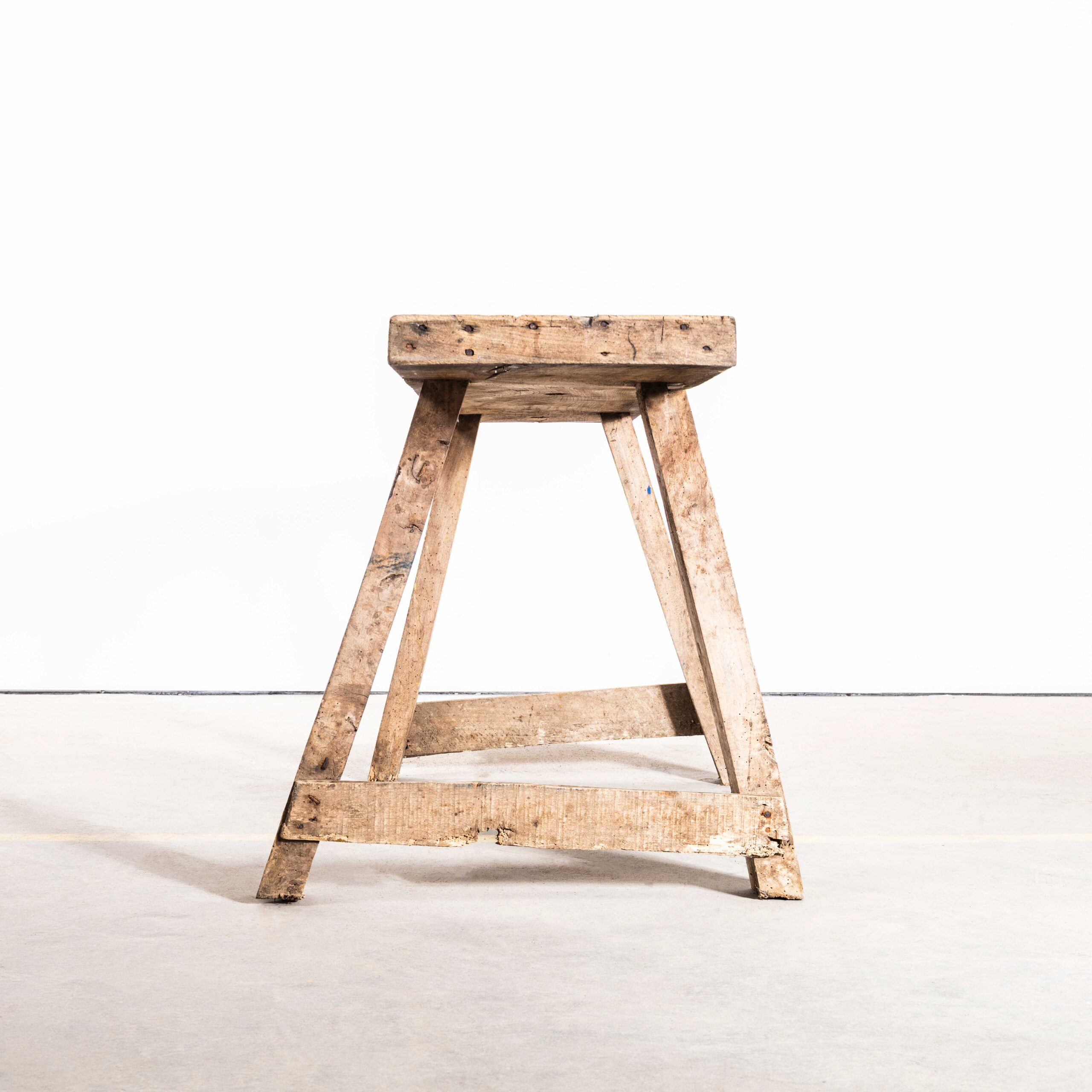 1950’s Rustic French Butchers Trestle Table. Good honest rustic French work table originally used in a butchers but multipurposed over the years no doubt as a handy workshop trestle. Solid with a rich sun bleached character, fruitwood. Our workshop has service it, it is stable but by design or nature it has a little movement.