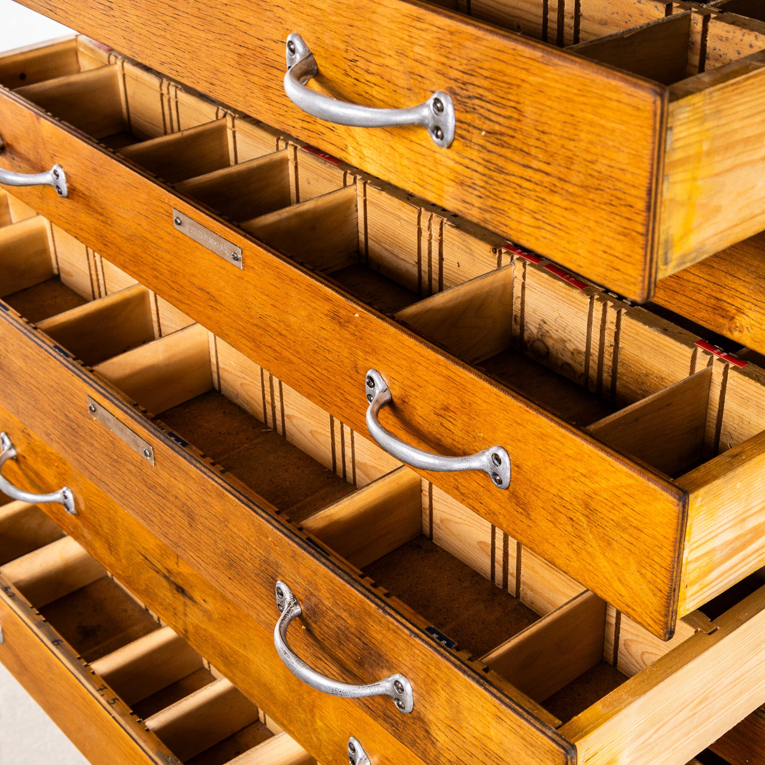 1950’s Tall Multi Drawer Engineers Cabinet – Fifteen Drawer. We recently cleared a factory outside Budapest and bought a number of these tall multi drawer cabinets that were used to store tools, components and equipment. Well made in solid beech wood with Masonite drawer bottoms. Our workshop has serviced the cabinet, cleaning and waxing throughout and adjusting the drawers so they run smoothly. The drawers have a mixture of internal dividers that can be adjusted and feature the original pressed metal handles. The cabinet is one piece.