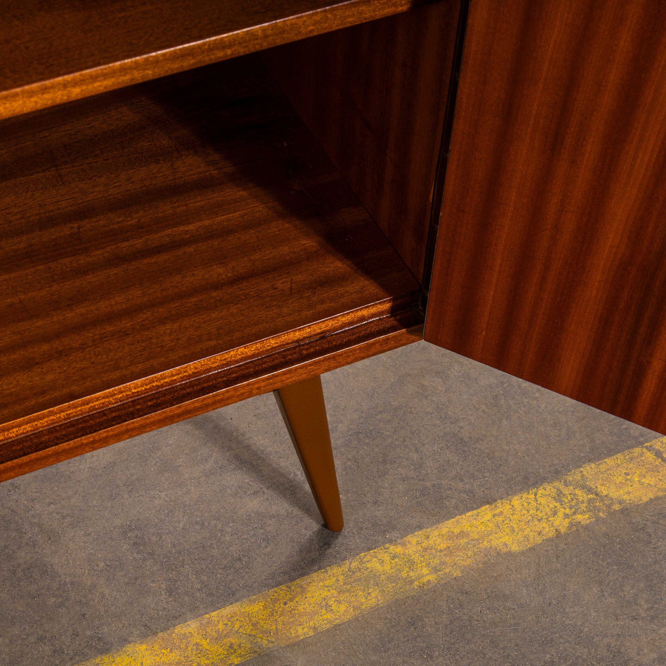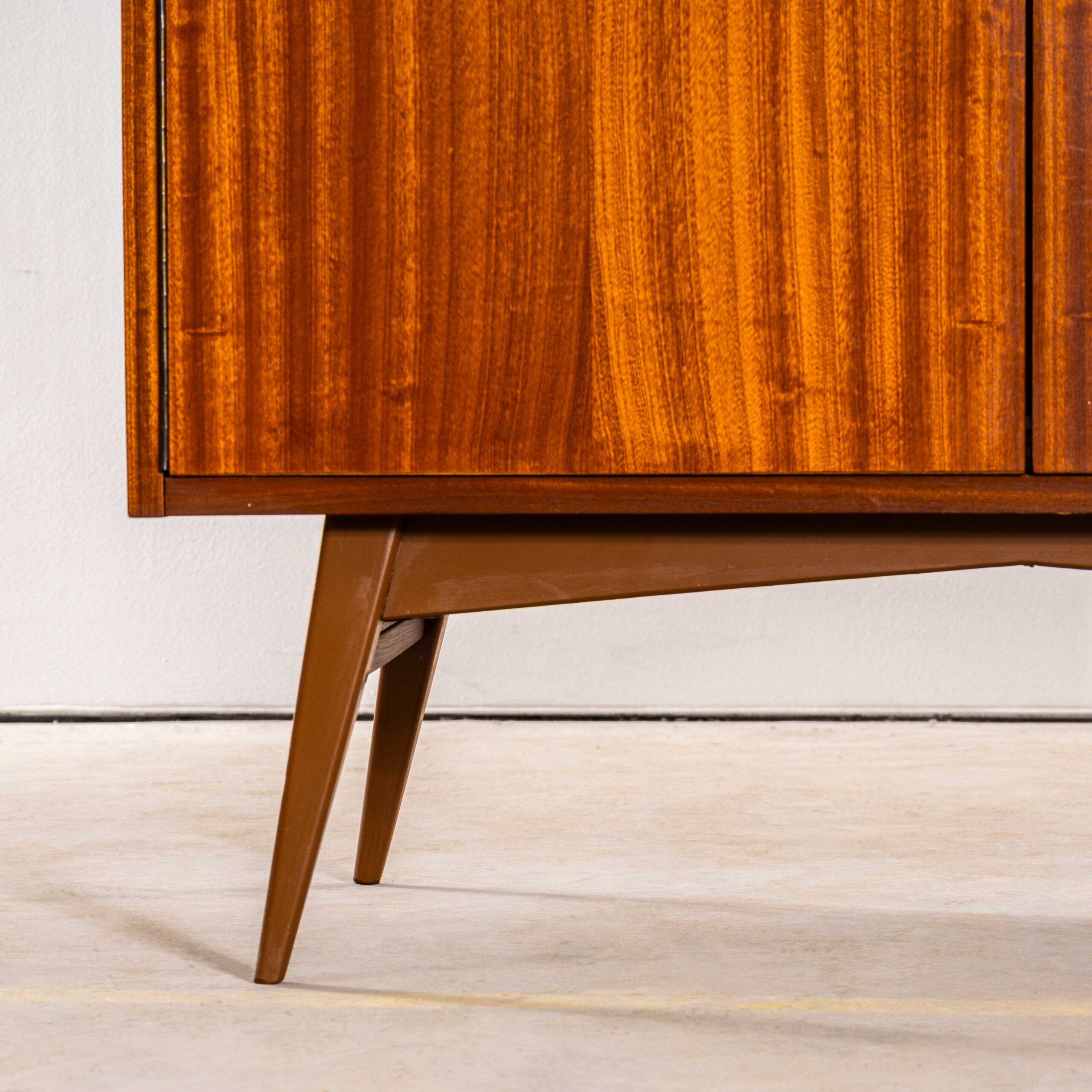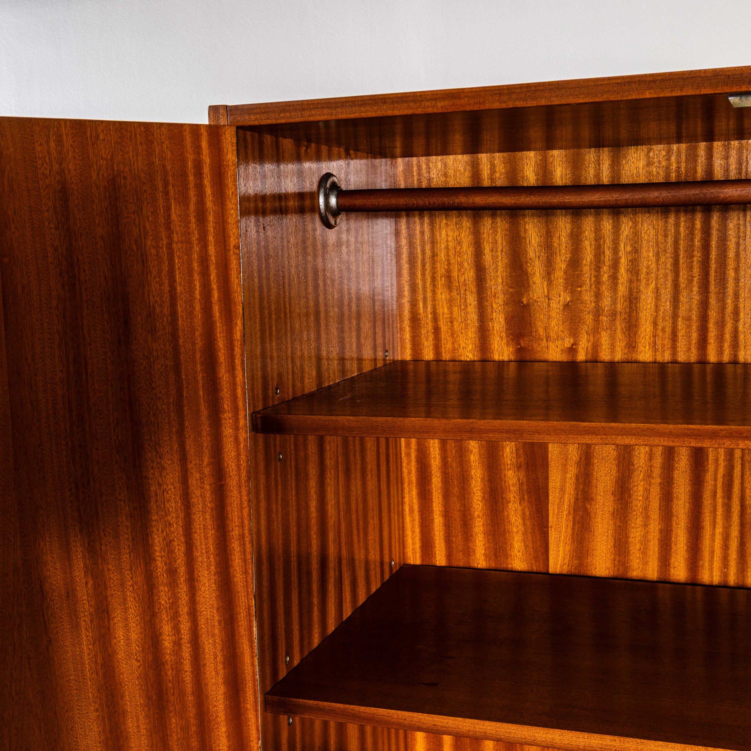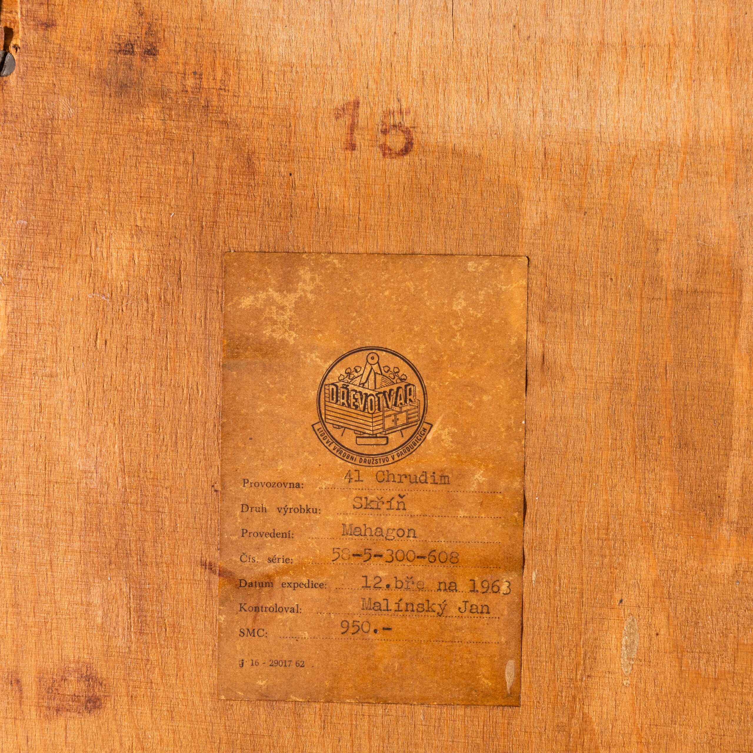 1960’s Compact Mid Height Living Room Cabinet. Produced by DÅ™evotvar in the Czech Republic. Czech design will always be affiliated to the Bauhaus movement which inspired a generation of design and industrial production in Czechia principally during the second half of the 20th Century with producers such as Ton and Up Zavody amongst many others. This is a high quality practical storage cabinet made in a rich dark sapele with a contrasting sapele interior. In exceptional original condition the cabinet has been sensitively restored in our own workshop. The cabinet features three full width adjustable shelves which are original plus an original wardrobe shelf which gives flexibility as the shelves are removeable (and adjustable). The cabinet sits on a graceful painted base. Internal dimensions: 47L x 90W. The shelves are set at 27H each. All in cm.