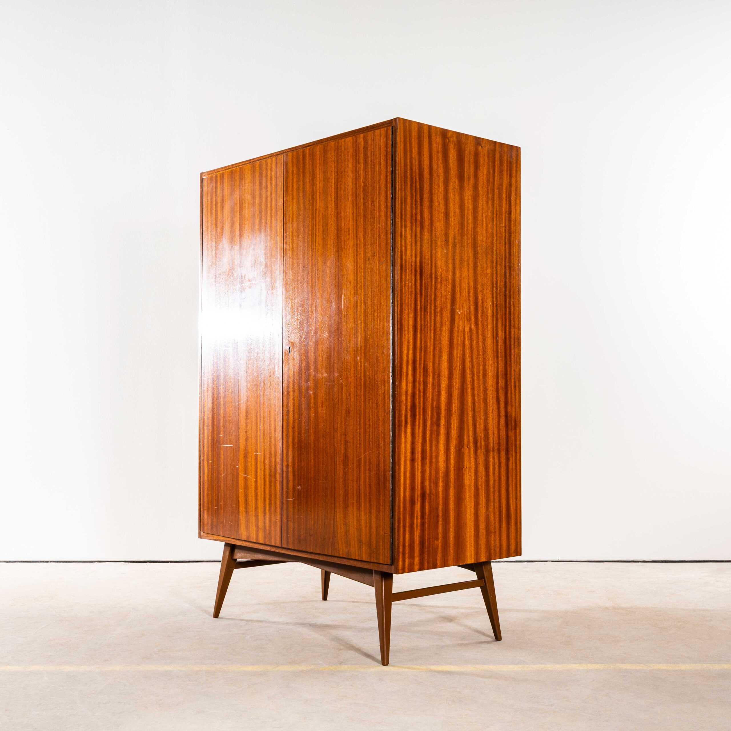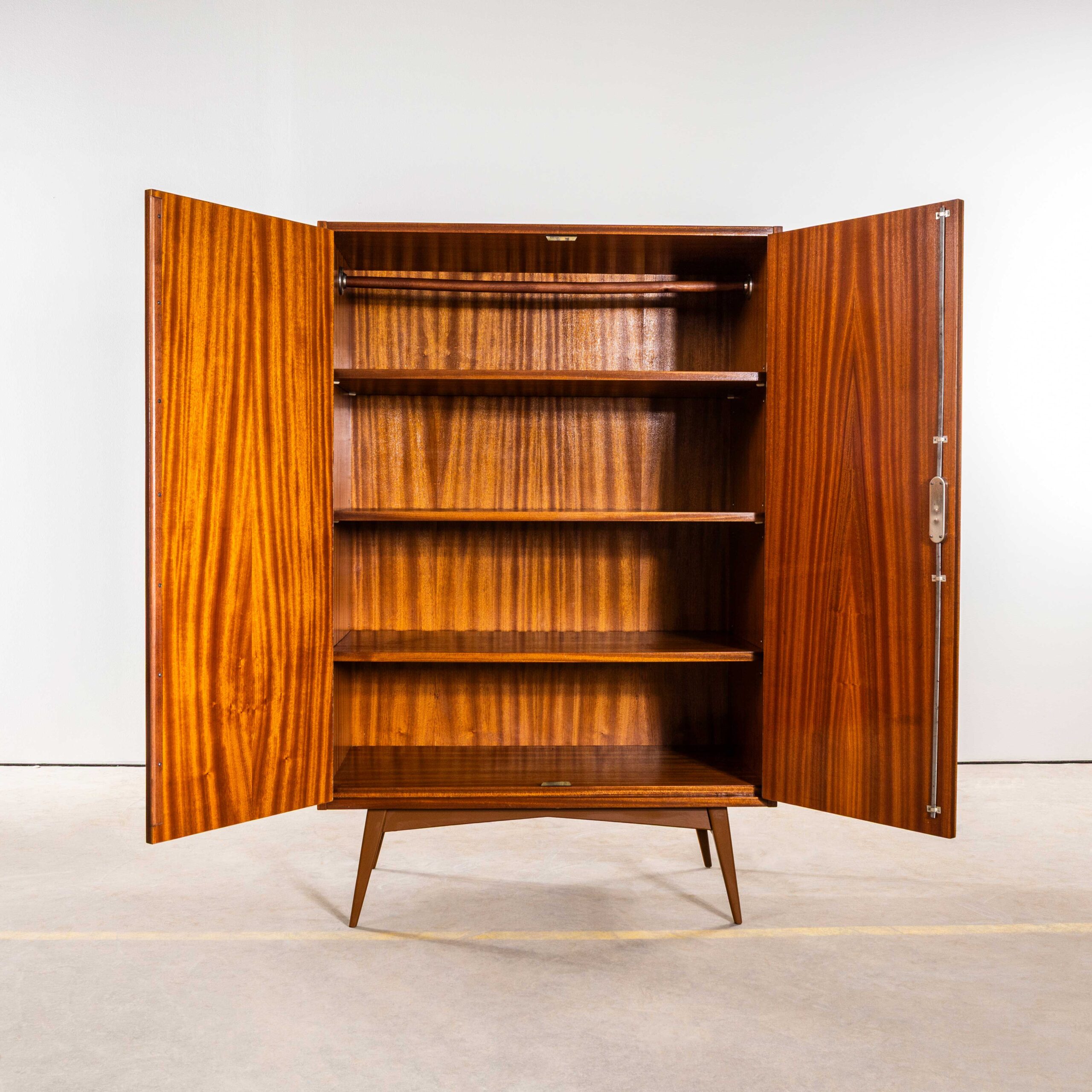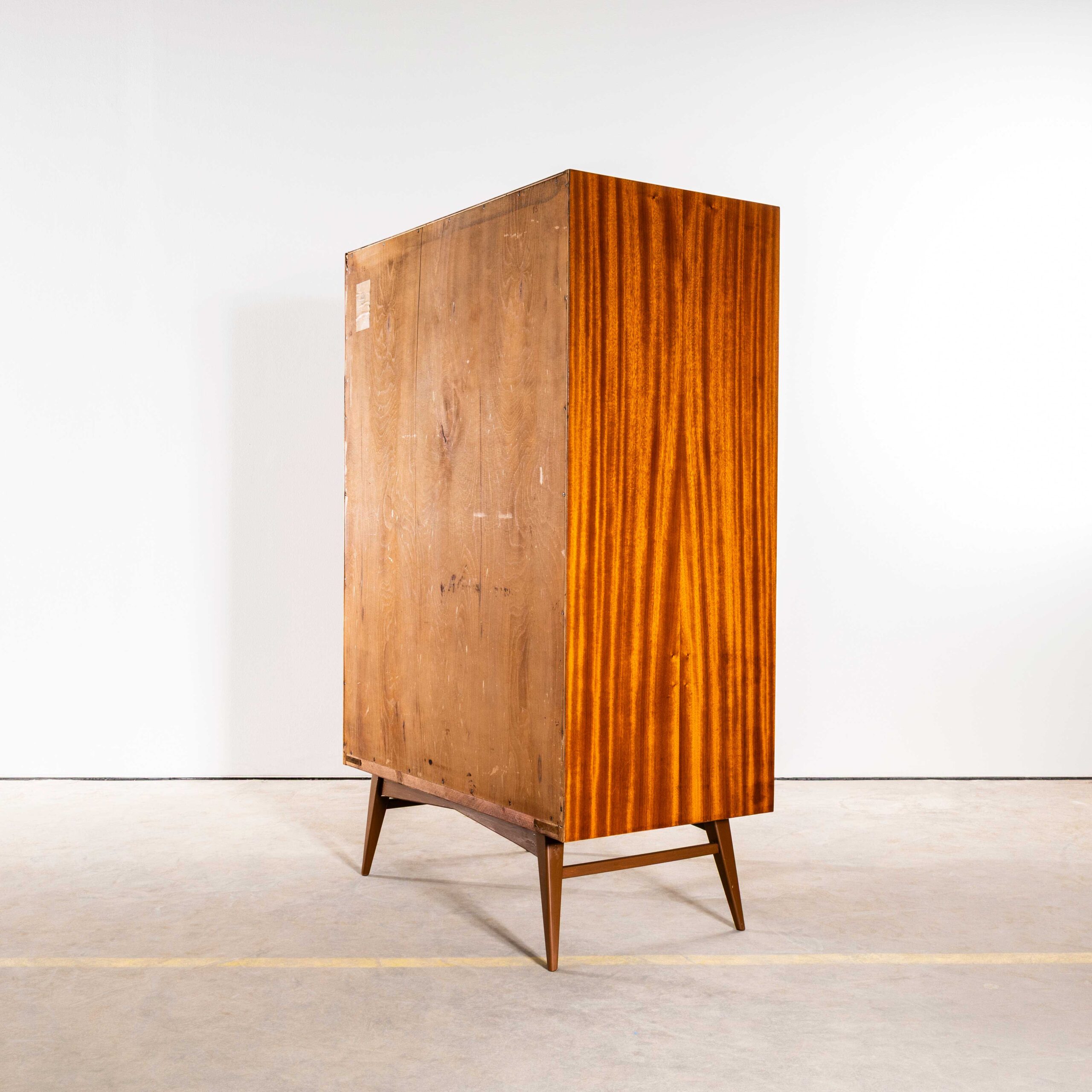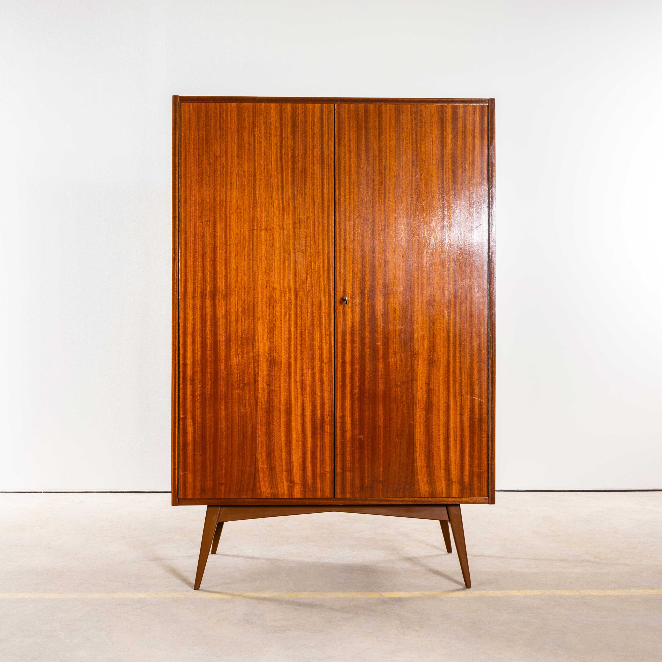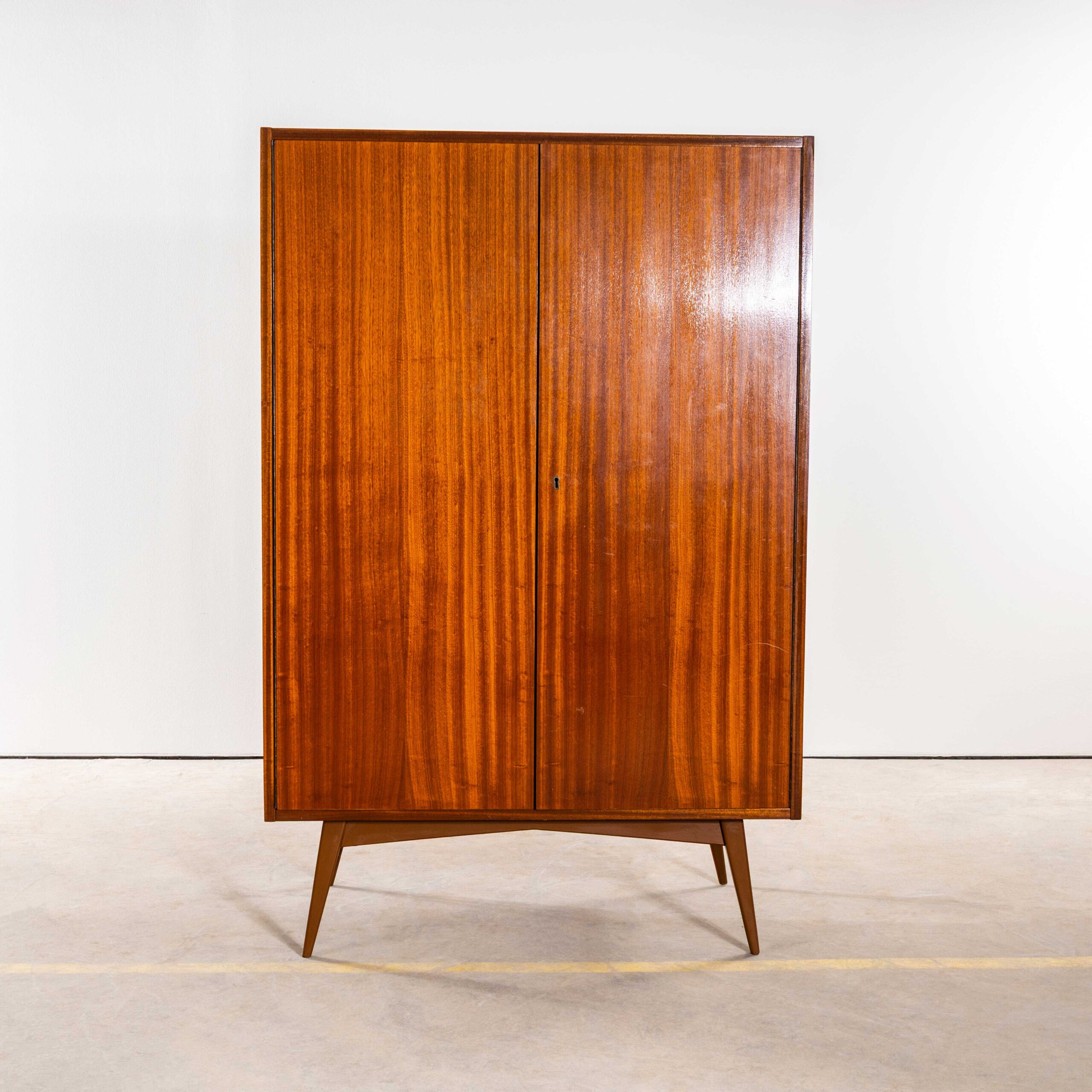 1960’s Compact Mid Height Living Room Cabinet. Produced by DÅ™evotvar in the Czech Republic. Czech design will always be affiliated to the Bauhaus movement which inspired a generation of design and industrial production in Czechia principally during the second half of the 20th Century with producers such as Ton and Up Zavody amongst many others. This is a high quality practical storage cabinet made in a rich dark sapele with a contrasting sapele interior. In exceptional original condition the cabinet has been sensitively restored in our own workshop. The cabinet features three full width adjustable shelves which are original plus an original wardrobe shelf which gives flexibility as the shelves are removeable (and adjustable). The cabinet sits on a graceful painted base. Internal dimensions: 47L x 90W. The shelves are set at 27H each. All in cm.