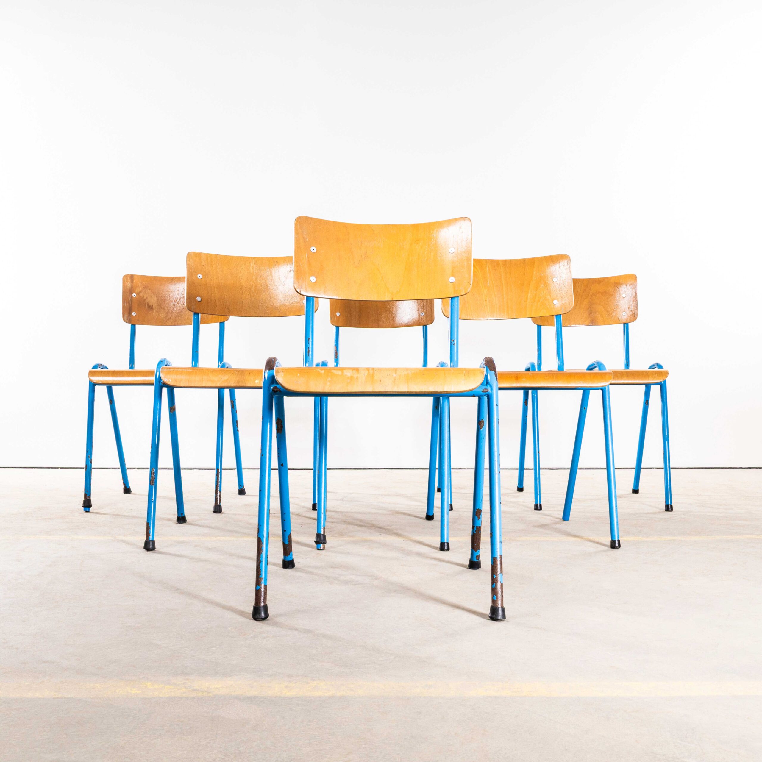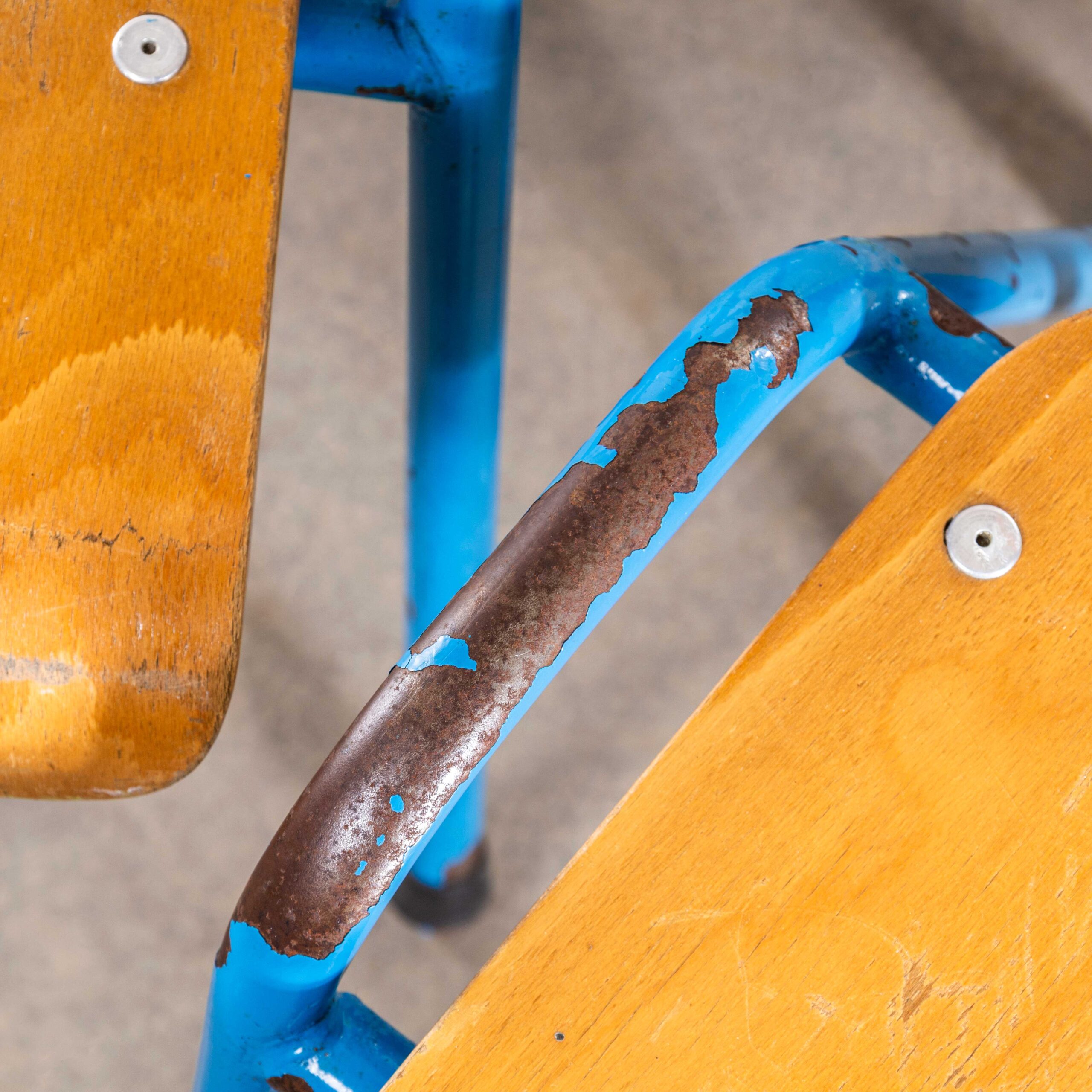 1960’s Elbe Blue Stacking Dining Chairs. These are vintage stacking school or university dining chairs, made with shaped birch seats and backs on a metal frame. These chairs are very sturdy with the shaped seats and backs solidly riveted to the frame. These will last a life time. The seats are moulded and incredibly comfortable. The condition is lovely and original with a gentle patina throughout. We service and rejuvenate each chair before they leave our workshop and we deliver chairs of excellent quality.
