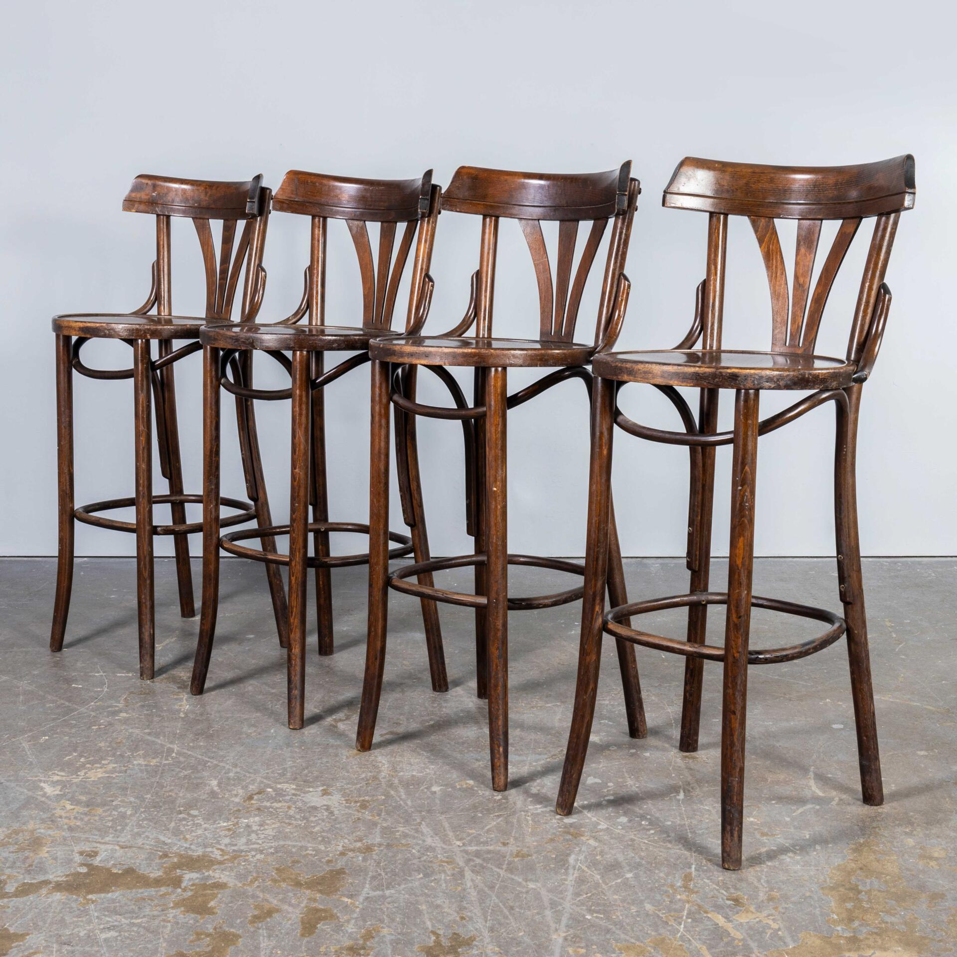 1960’s Saddle Back Bentwood Bar Chair – Set Of Four. Good quality set of classic bentwood bar chairs with a classic saddle back design. The chairs were made in Eastern Europe using solid steam bent beech, they are a rich dark walnut colour with a lovely wear and age. Each chair is serviced individually in our own workshops. Seat Height 76cm