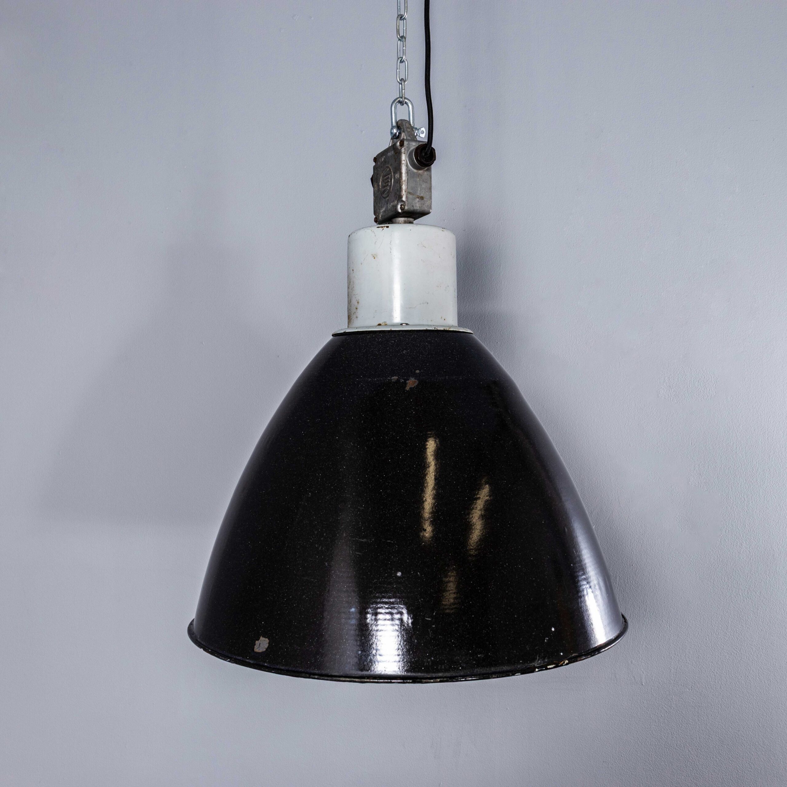 1960’s Very Large Industrial Black Enamel Ceiling Pendant Lamps. A mainstay of many eastern European factories these lamps feature large scale enamelled steel shades and cast metal tops. The key feature of these lamps is their stunning original condition and size, we have large volumes available and they are being sold singularly. These lamps are strong visual statements perfect for a hall, contemporary kitchen or living space. Each lamp has been cleaned and restored and all electrical components have been removed and replaced with modern European CE standard components to BS EN 60598. Each lamp is individually tested and labelled to BS EN 60598. INCLUDED: Each lamp comes completely wired and ready to install including; 2 metres of zinc coated chain for hanging the lamps, 2 metres of black fabric covered electrical cable and a ceiling hook as shown. The lamp is fitted with a standard E27 threaded lamp holder for which a wide range of modern and vintage style filament bulbs are widely available. We do not currently sell bulbs and recommend LED bulbs 6W maximum. We can supply more than 2 metres of hanging cable/wire/chain etc as required, please contact us separately to discuss. We are specialists in refurbishment of vintage lighting, please contact us with any questions regarding purchase or installation.