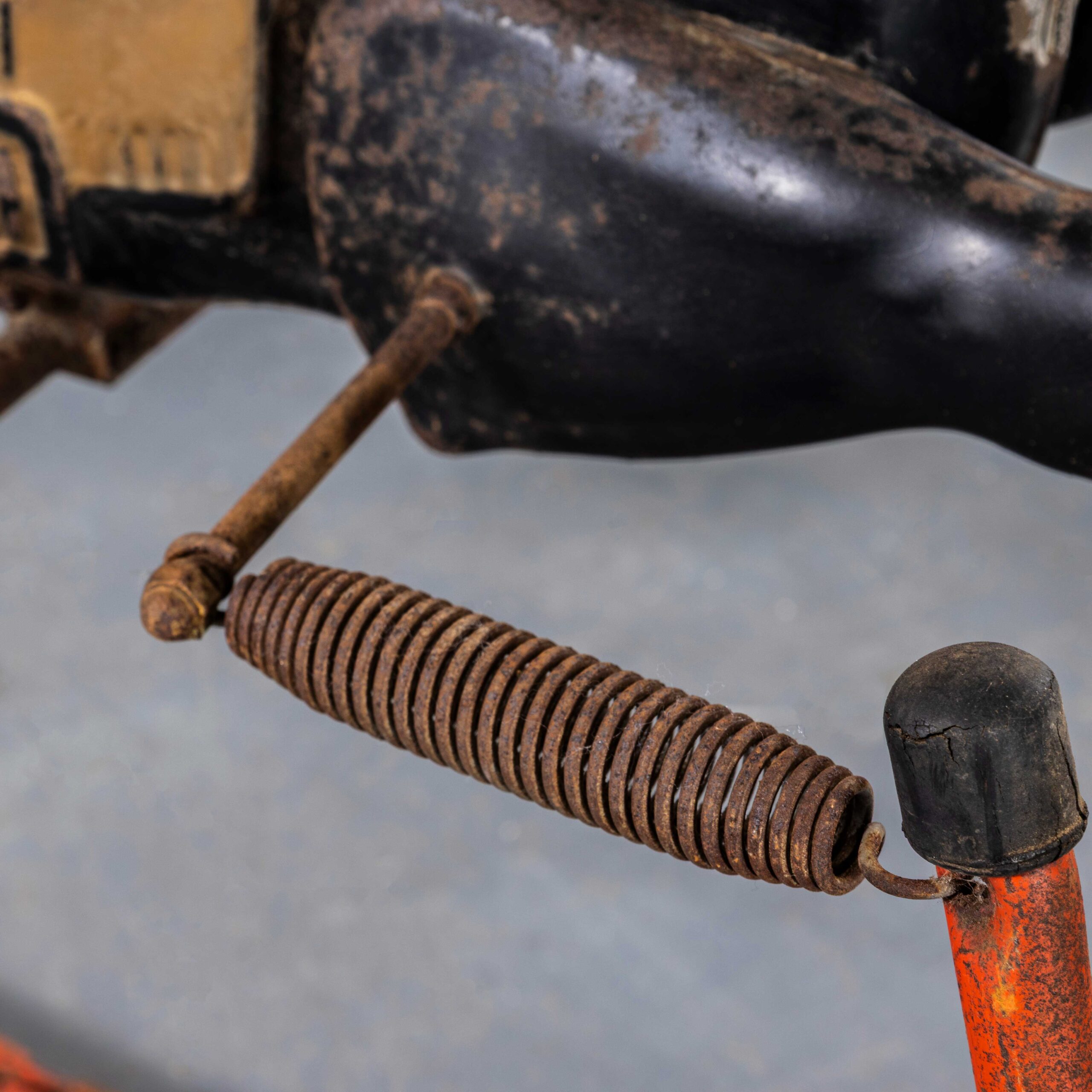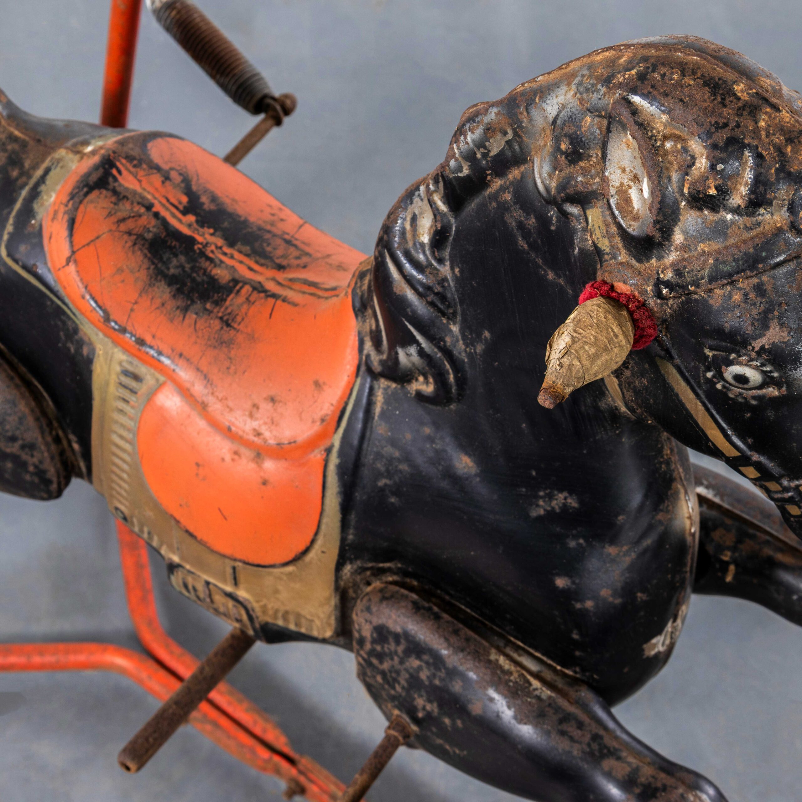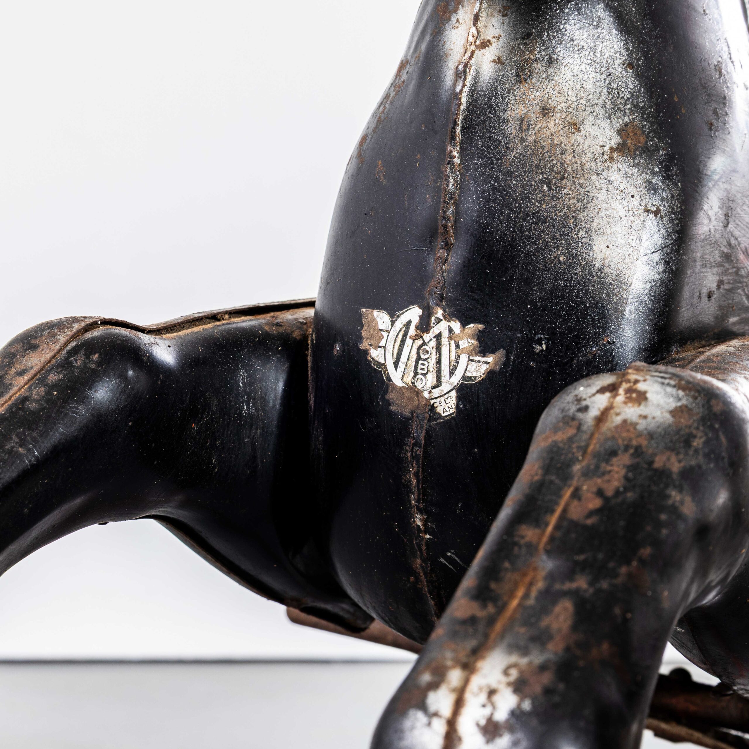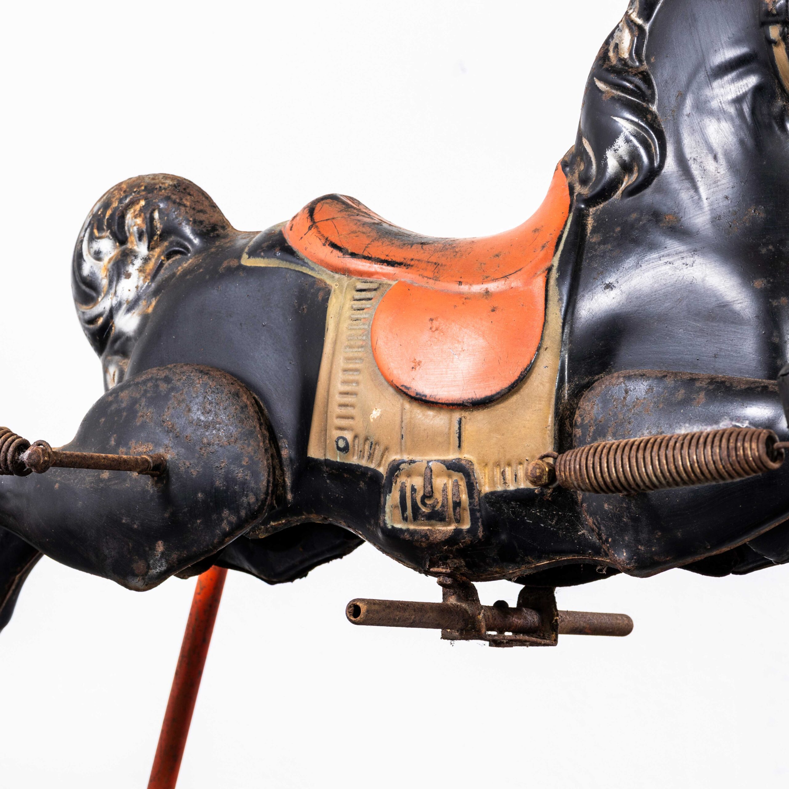 1960’s Vintage MOBO Painted Tin Plate Rocking Horse. Classic pressed metal rocking horse by MOBO. MOBO started its journey with David Sebel a Russian who emigrated to England at the beginning of the 20th Century, and set up in partnership as a wheelwright in East London. The business was successful and as they grew, they expanded and Harry pioneered a new level and quality of British made toys. Manufacturing techniques developed in the war helped fuel an innovative ‘ride on’ Bronco horse powered by a quite sophisticated mechanism based on bicycle gears. The mechanism took a number of years to fully develop and was patented, the prototype clay body was sculpted by the RA artist Charles Morewood. The genius behind their toys was the mobility, ride on horses used the child’s body movements to mechanically power the toy horse along, pushing up and down on the stirrups propelled the horse. MOBO was famous for quality steel toys and is one of our favourite makers. The listing is for the horse as shown. It is sold as a stunning decorative object only. DO NOT use as a toy as it does not comply with current safety regulations and is not safe to ride on.