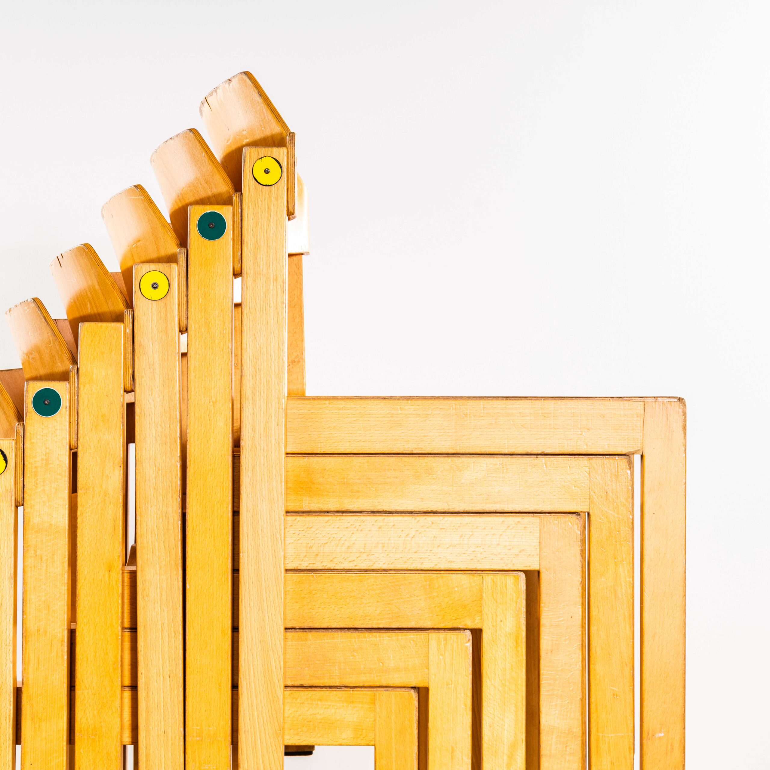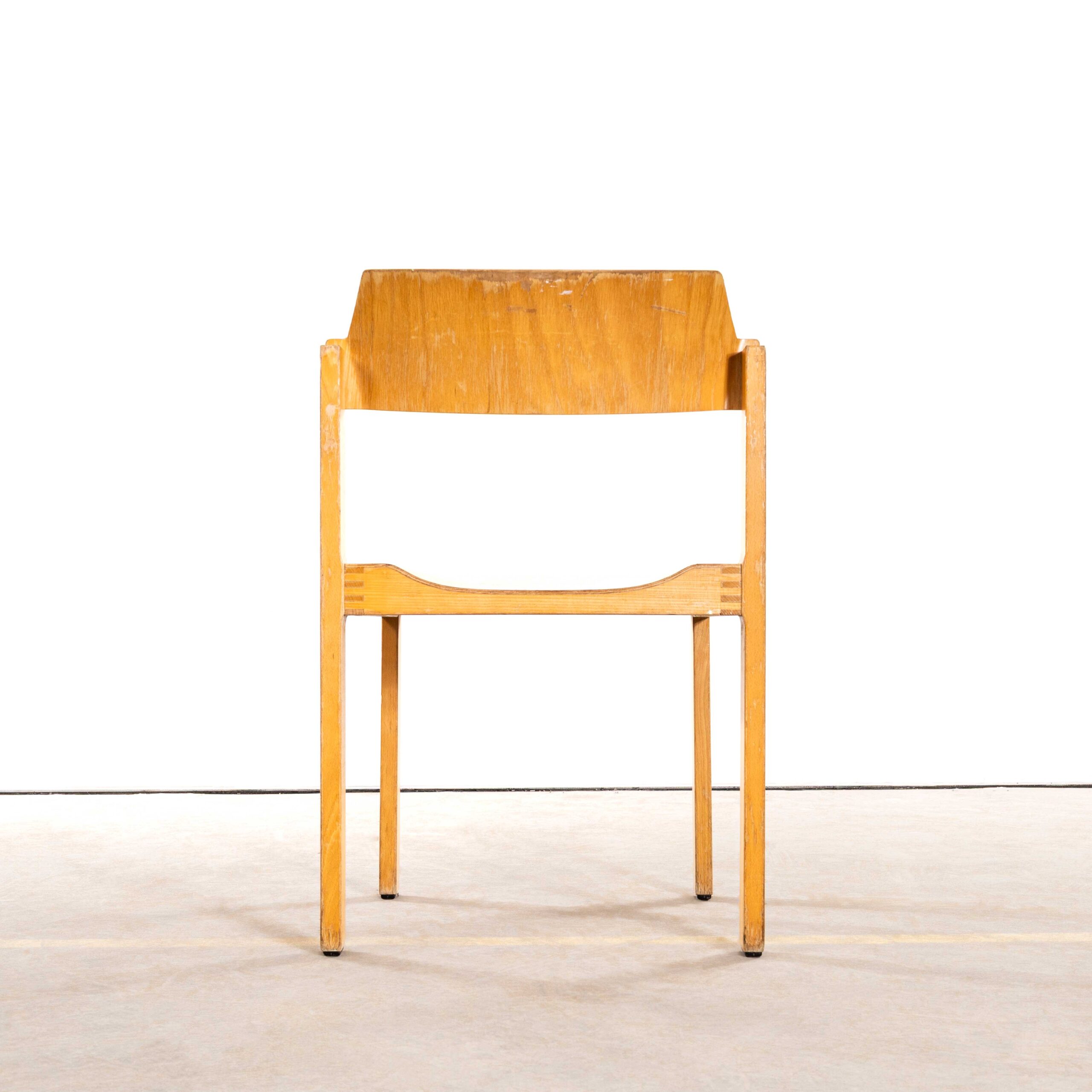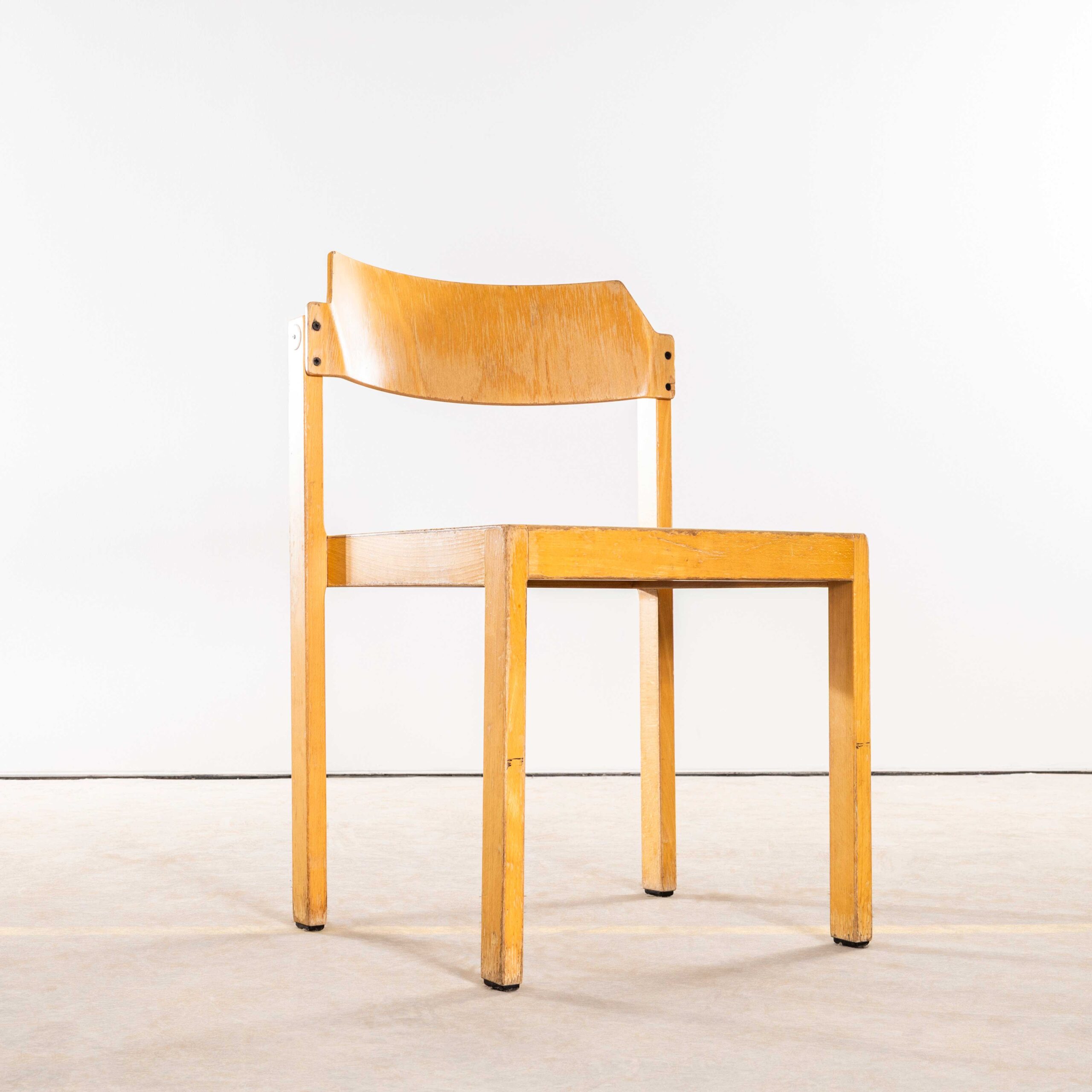 1960’s Wide Elegant Clean Stacking Blonde Dining Chairs. Very good batch of French mid century dining chairs. Sadly we don’t know the maker but they came from a French college and are obviously well made, we suspect they were custom made by Casala but we don’t know. The frames are solid beech and the seats and backs are formed/bent birch and beech. The chairs are in excellent condition and the scooped seat makes them comfortable. All chairs will pass through our workshop where they will be serviced, cleaned and waxed, ready to go. Unusual to find such as simple and elegant mid century chair in a lighter colour.