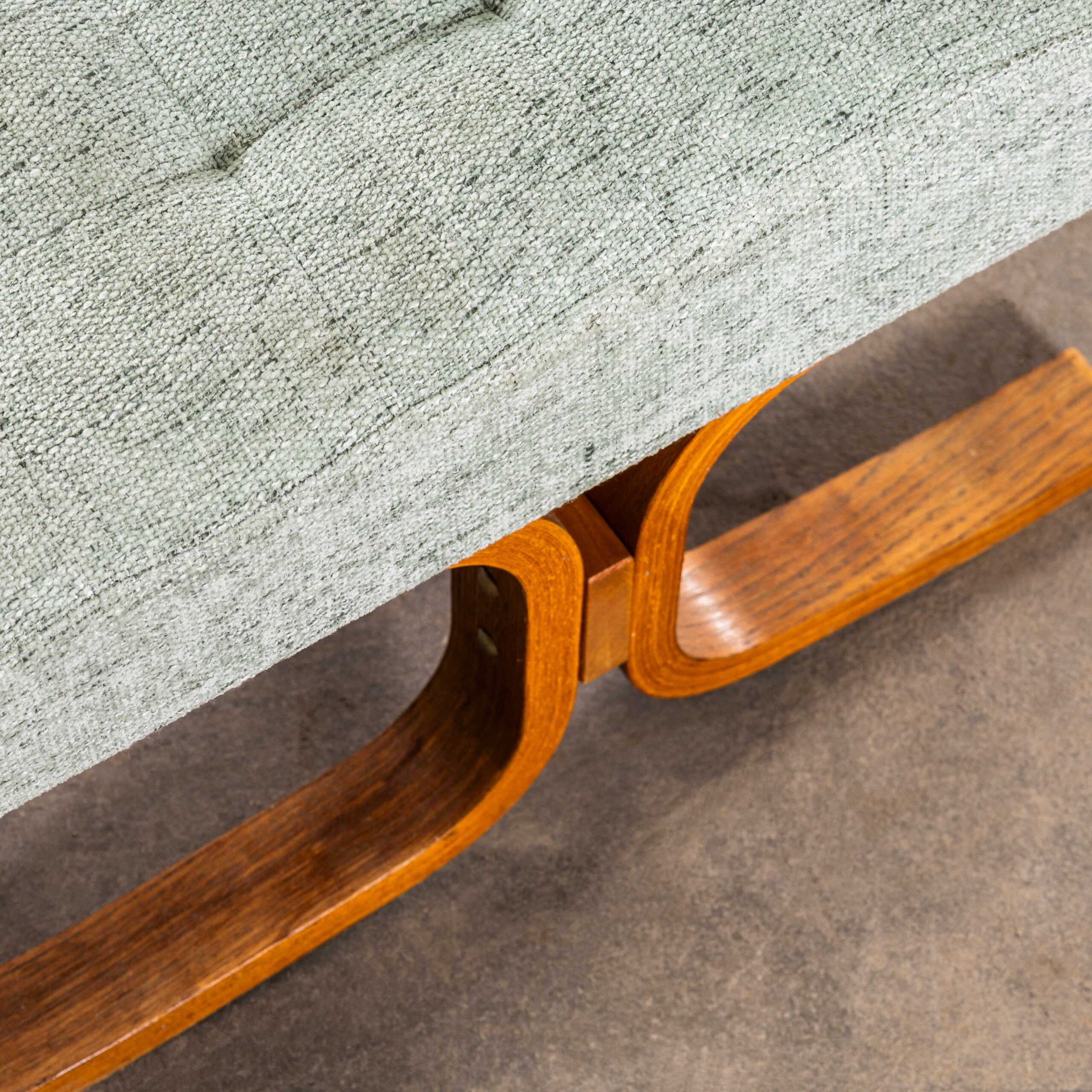 1970’s Ludvik Volak Sea Foam Slubbed Weave Reupholstered Bratislava Side Chairs. Sourced direct in the Czech republic, Volak is one of the most celebrated mid century designers best known for the organic room divider made by Drevopodnik Holesov. Volak was commissioned to make the Bratislava chair for the international airport of Slovakia. These mid century chairs are made with laminated beech frames and buttoned upholstery, our upholster has stripped the internal components and rebuilt and reupholstered them by hand. The chairs have been reupholstered in Sea Foam Slubbed Weave. Please note the chairs are not compliant with UK fire regulations and can only be sold outside the UK.