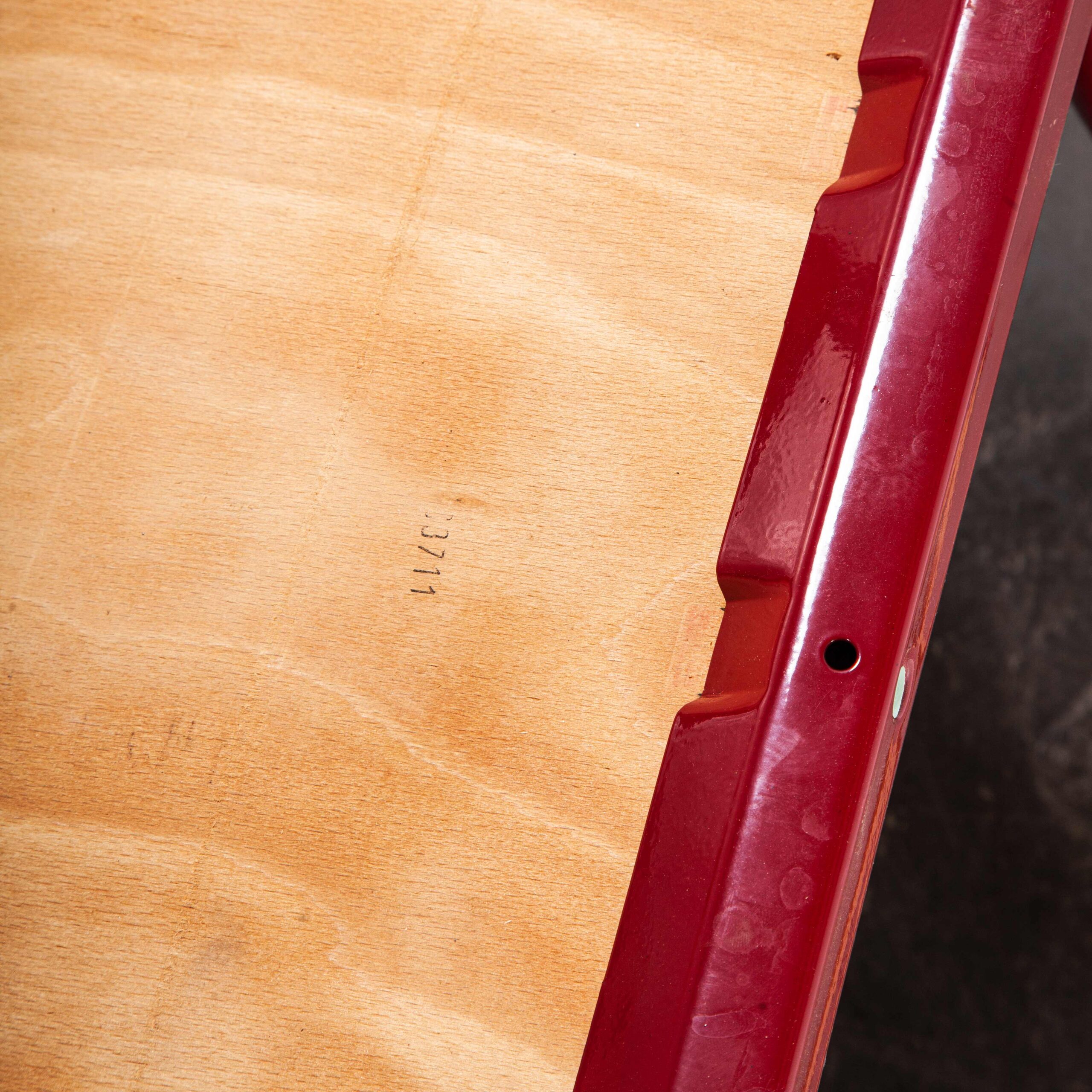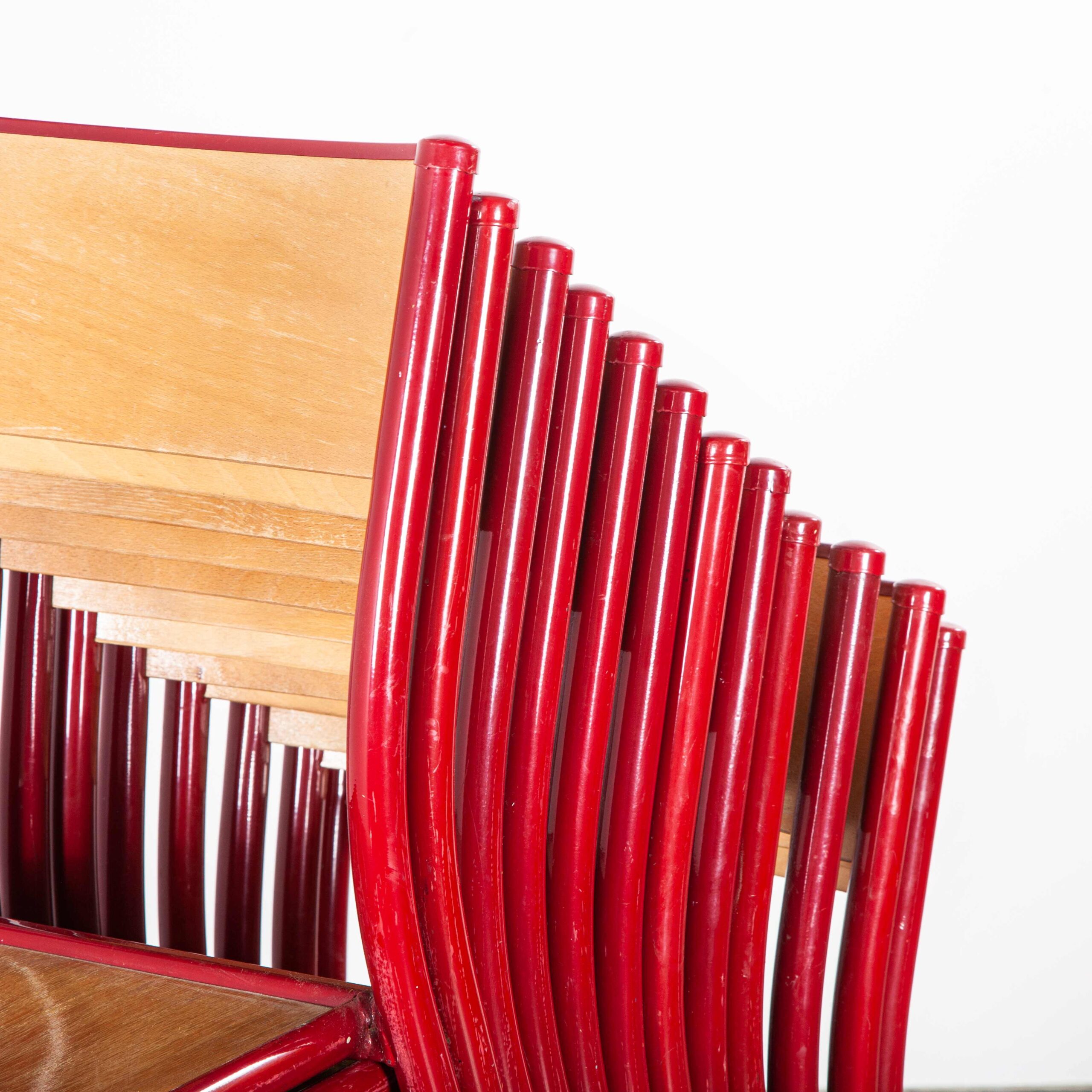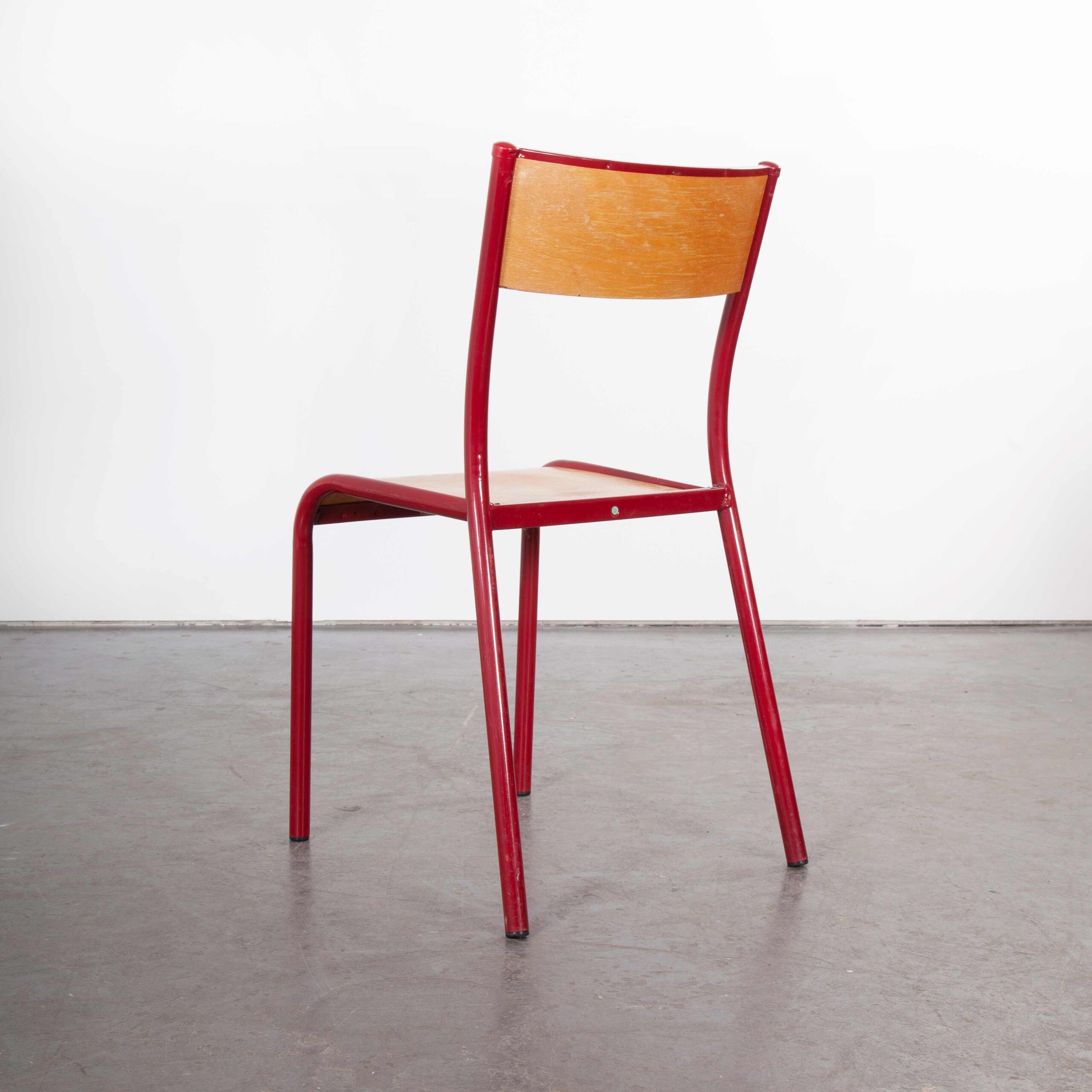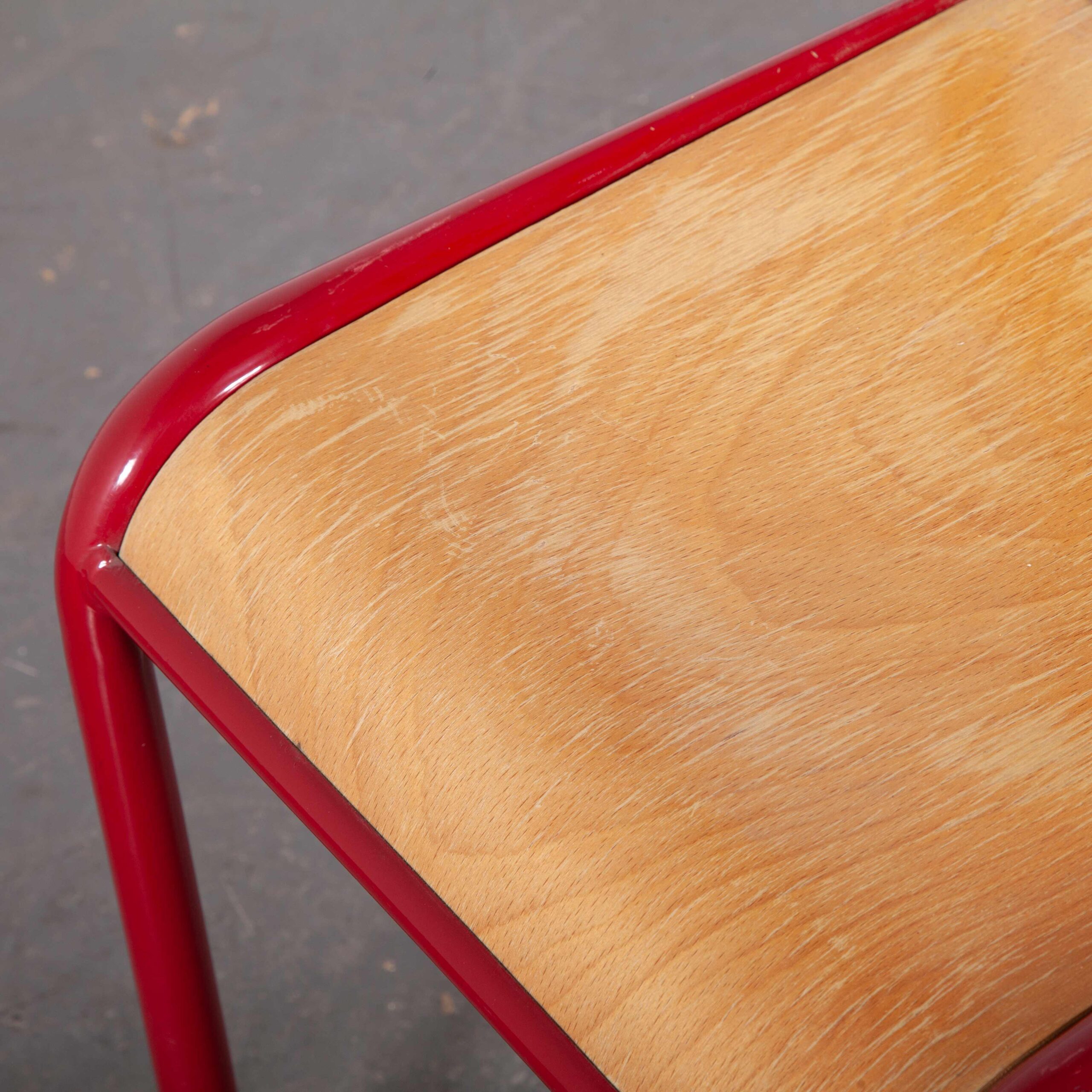 1970’s Red Mullca Stacking Dining Chair With Beech Seat. One of our most favourite chairs, in 1947 Robert Muller and Gaston Cavaillon created the company that went on to develop arguably the most famous French school chair. Sadly the company no longer exists but vintage chairs can still be found, beautifully made with a strong tubular frame with beech seats and back inserts. Ours date from the early 1970’s and are in good condition. In this batch of chairs we had some minor imperfections but these are shown in the photos. Super comfortable and stylish. We service each chair individually before they leave our workshop.